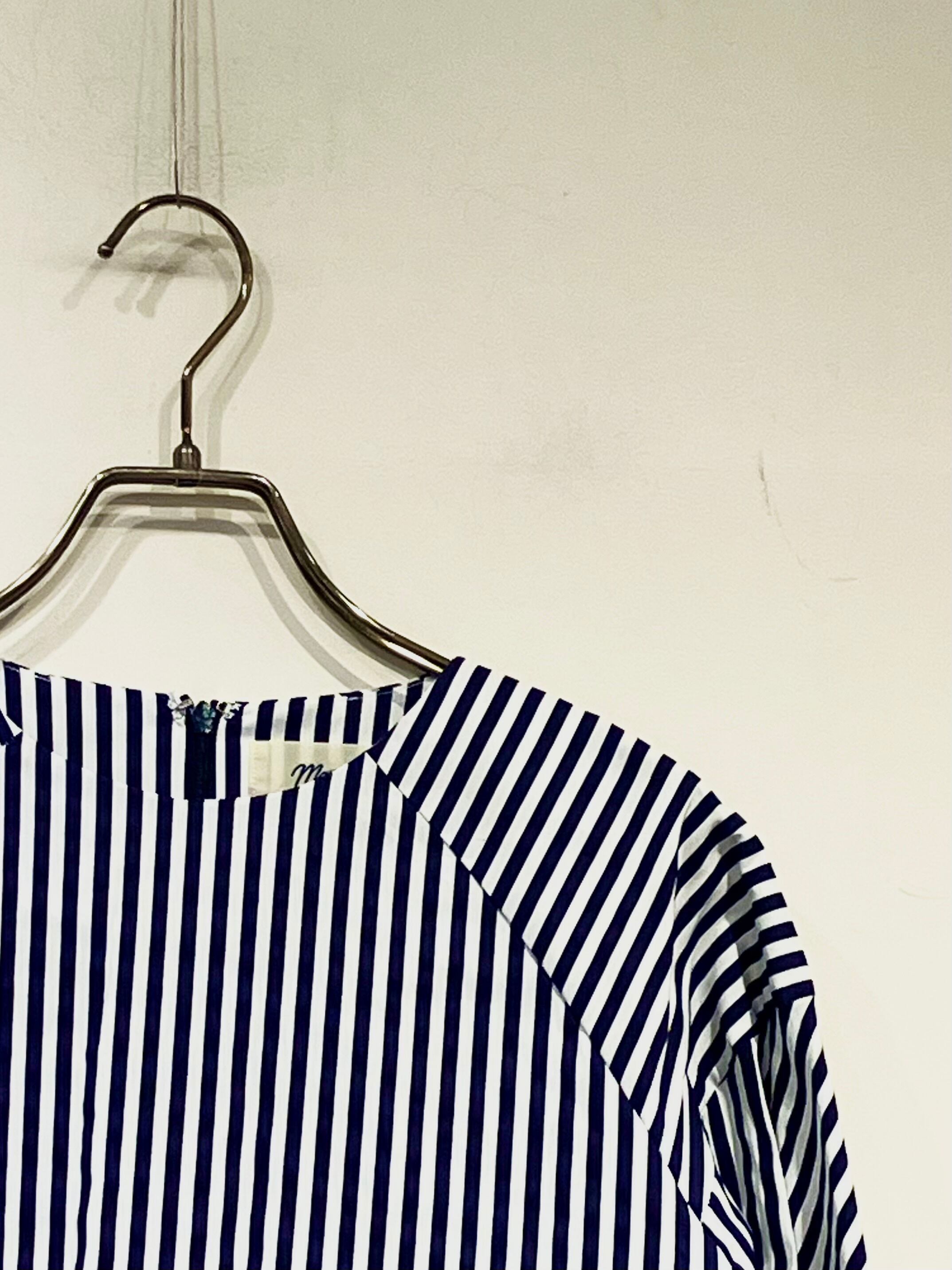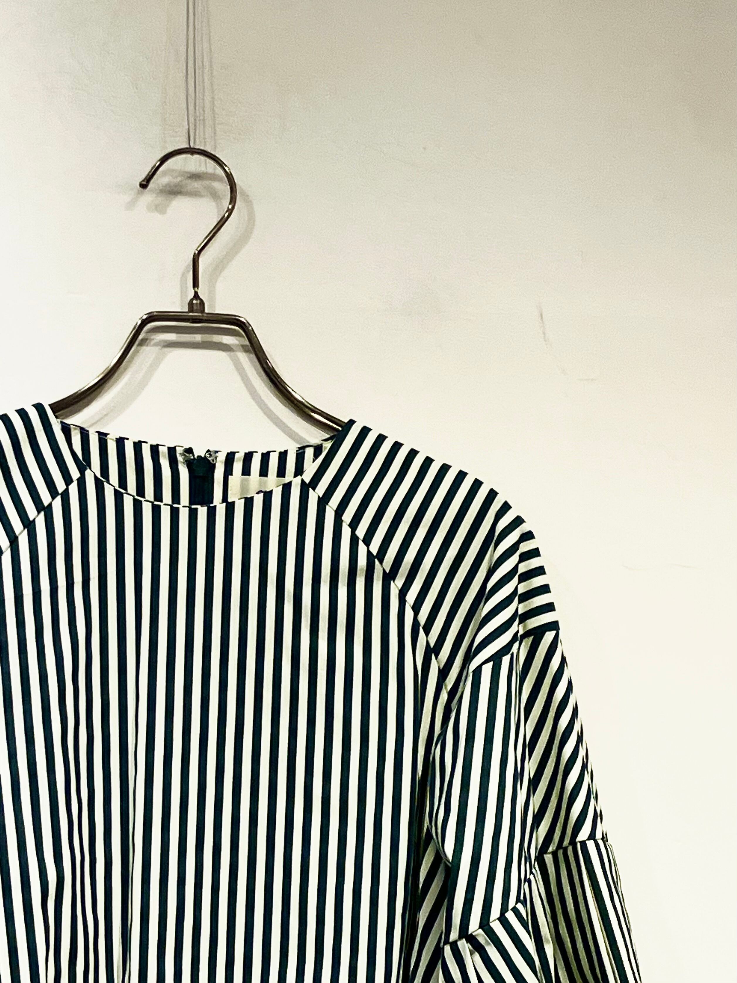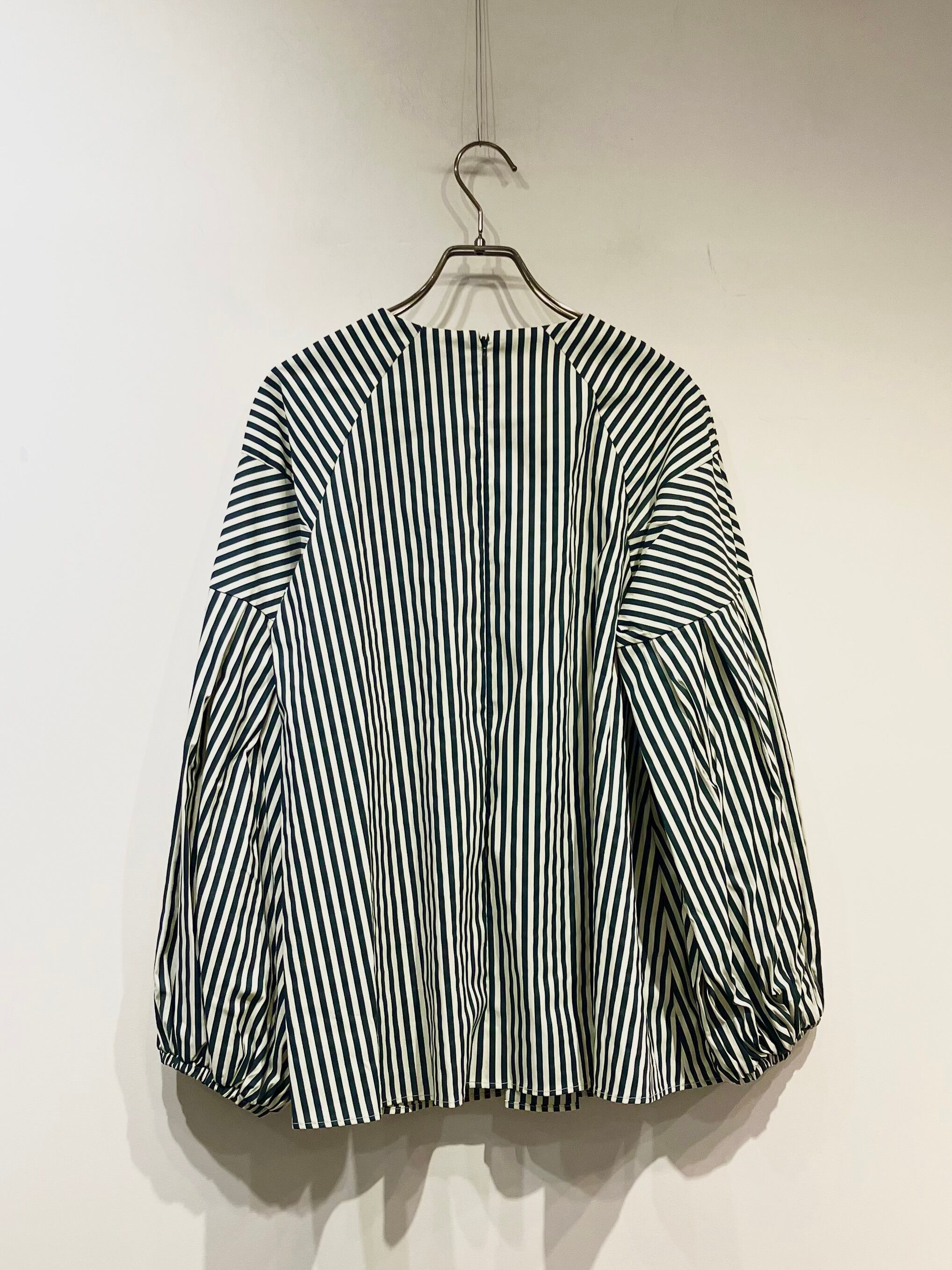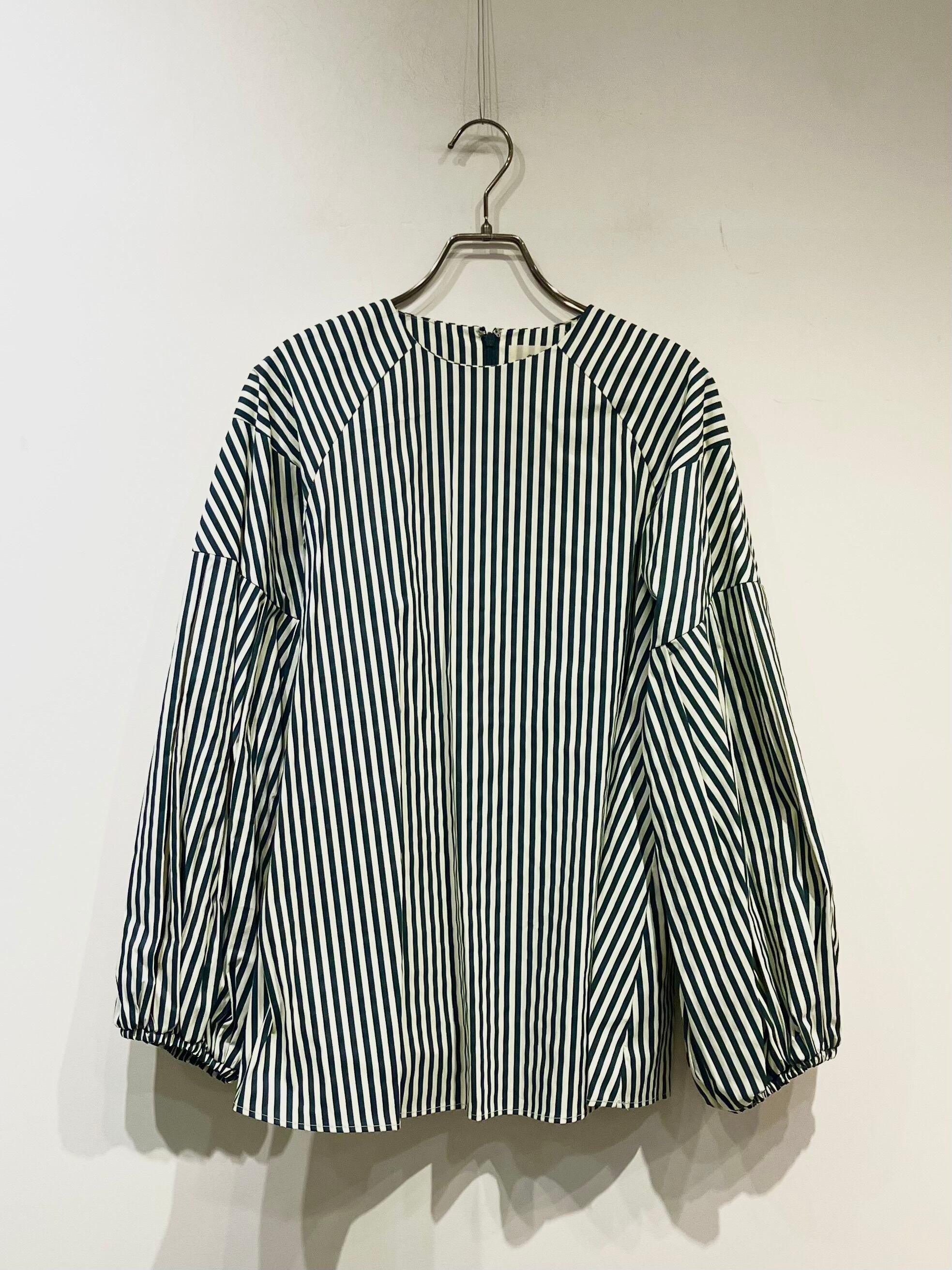 ストライプ柄と、存在感のあるボリュームスリーブが目をひくブラウス。