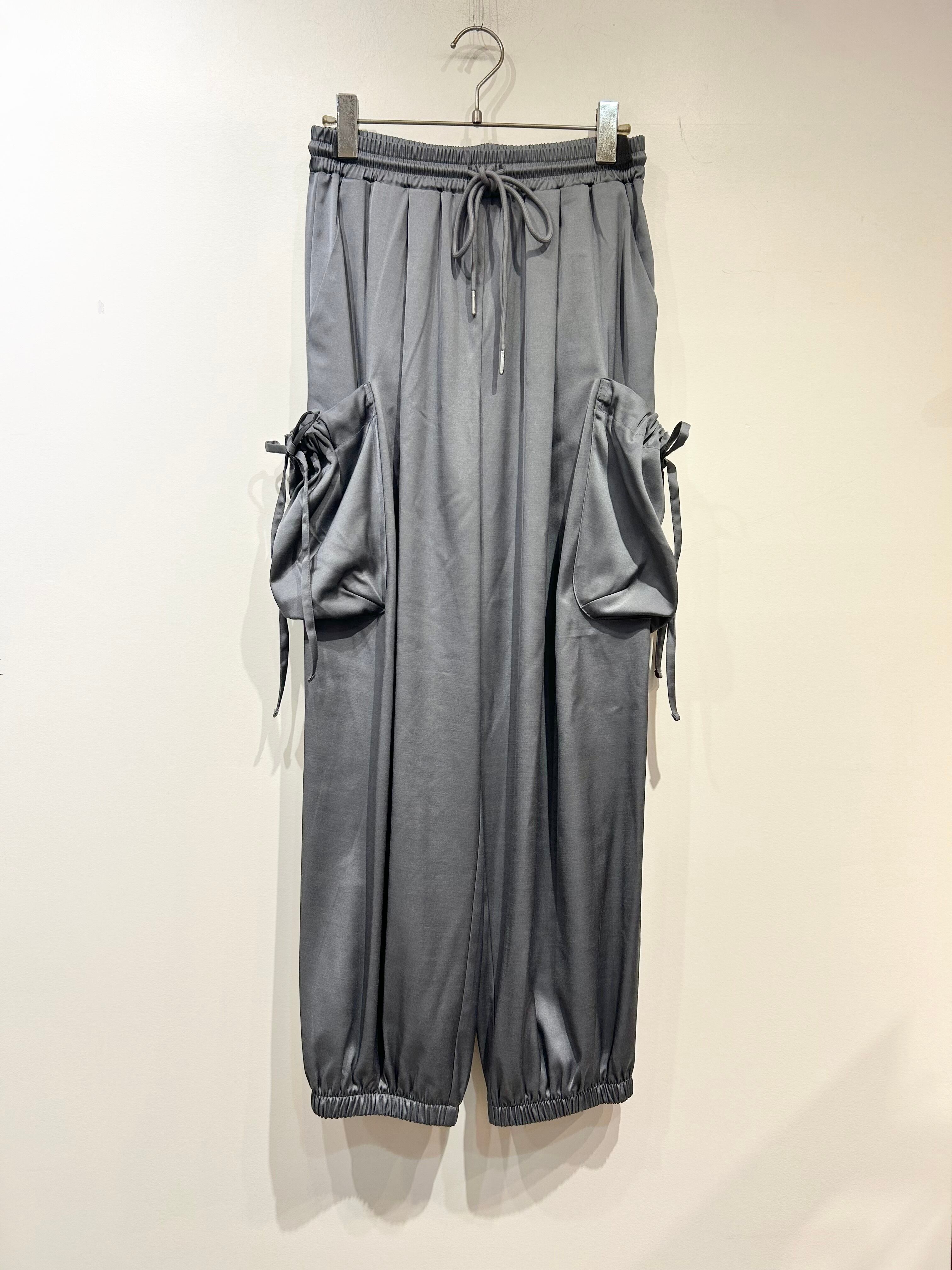 ポケットのシャーリングがポイントのサテンジョガーパンツ。