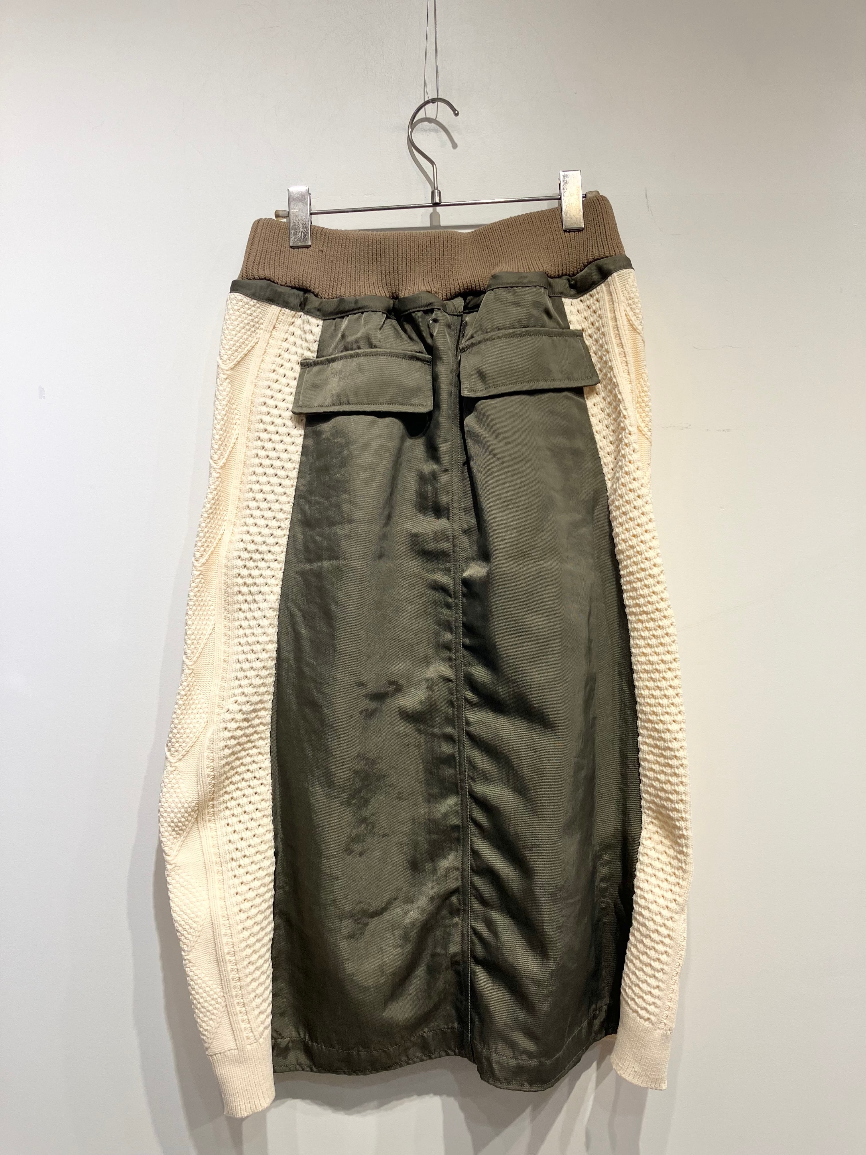 両サイドにはウォーム感の少ないタイプの模様編みニットを組合せた軽快なデザイン。