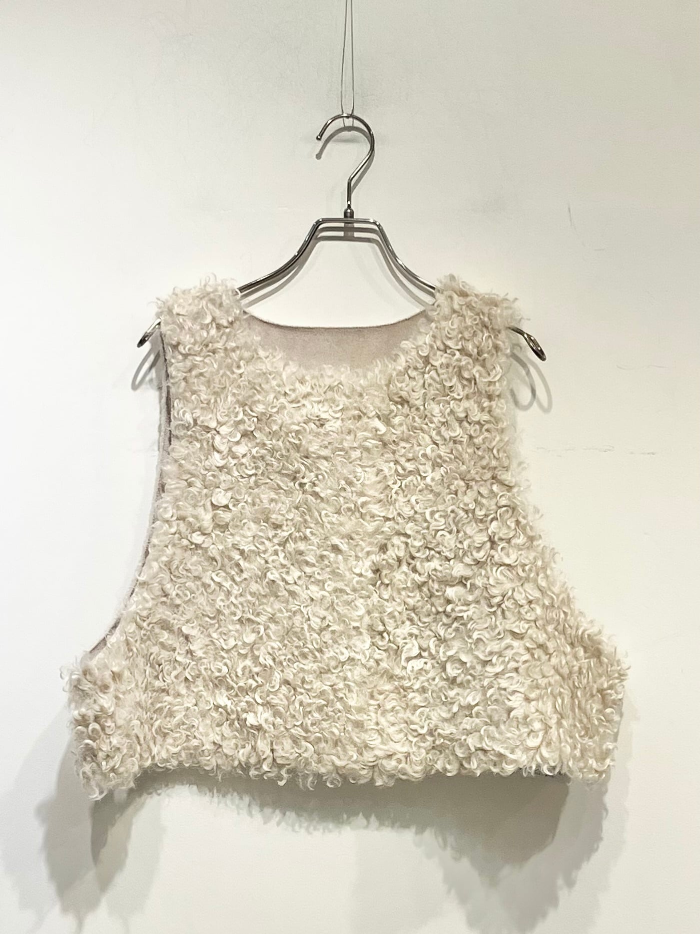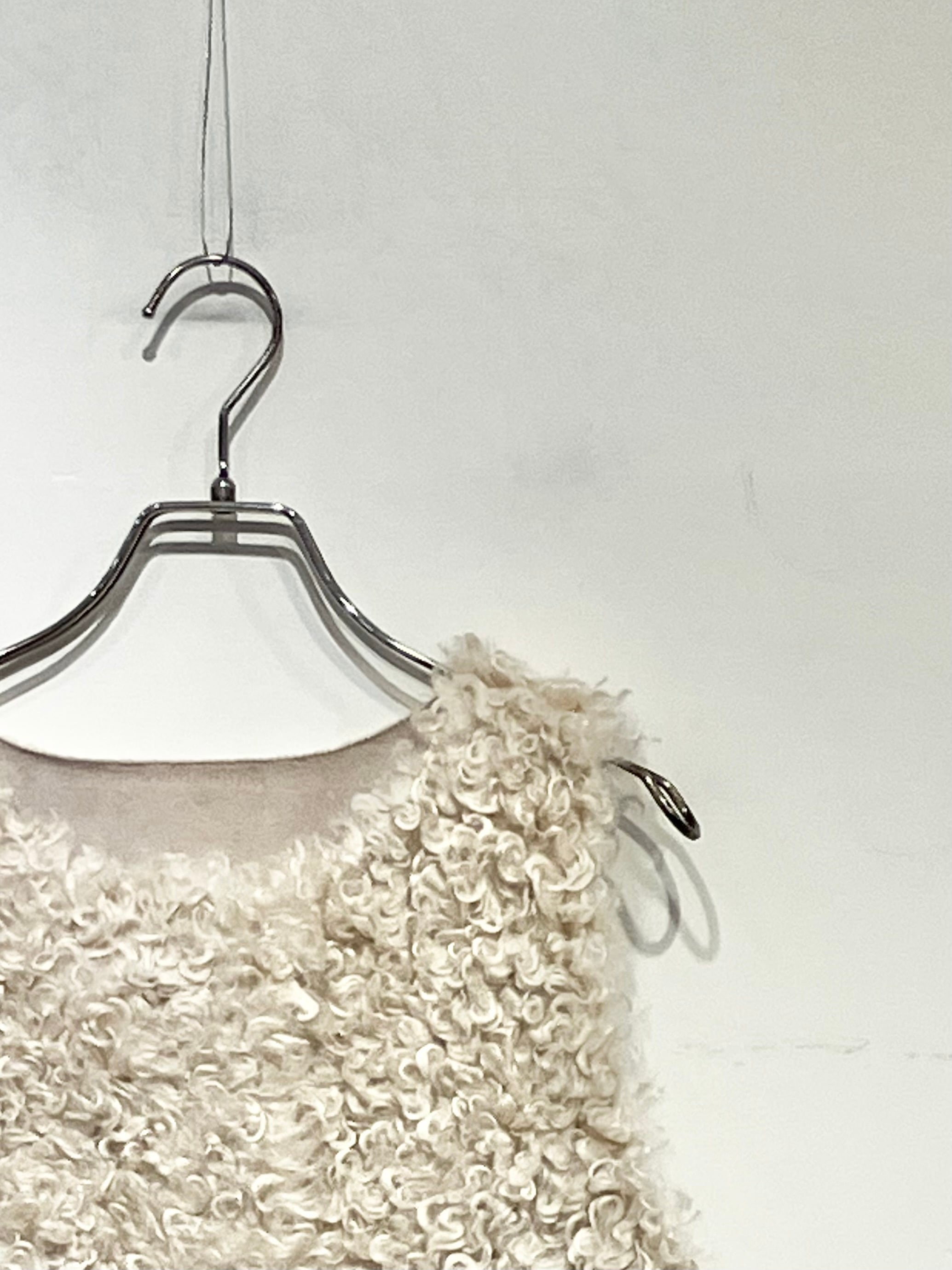 前身頃はカールファー、後ろ身頃は毛足短めのウールボアを使用することで
