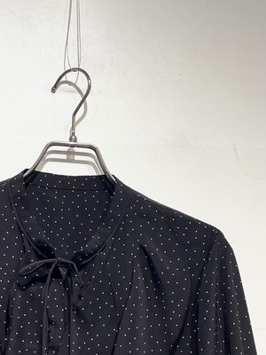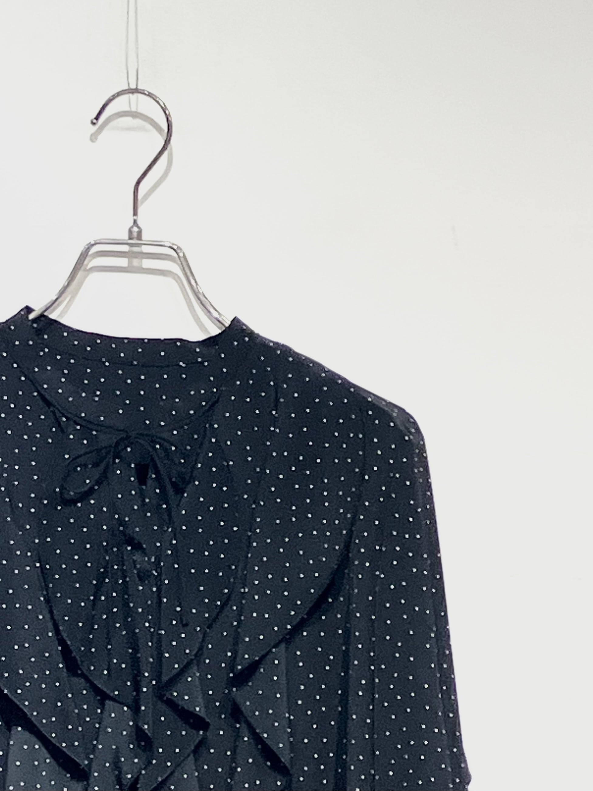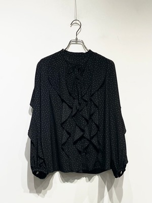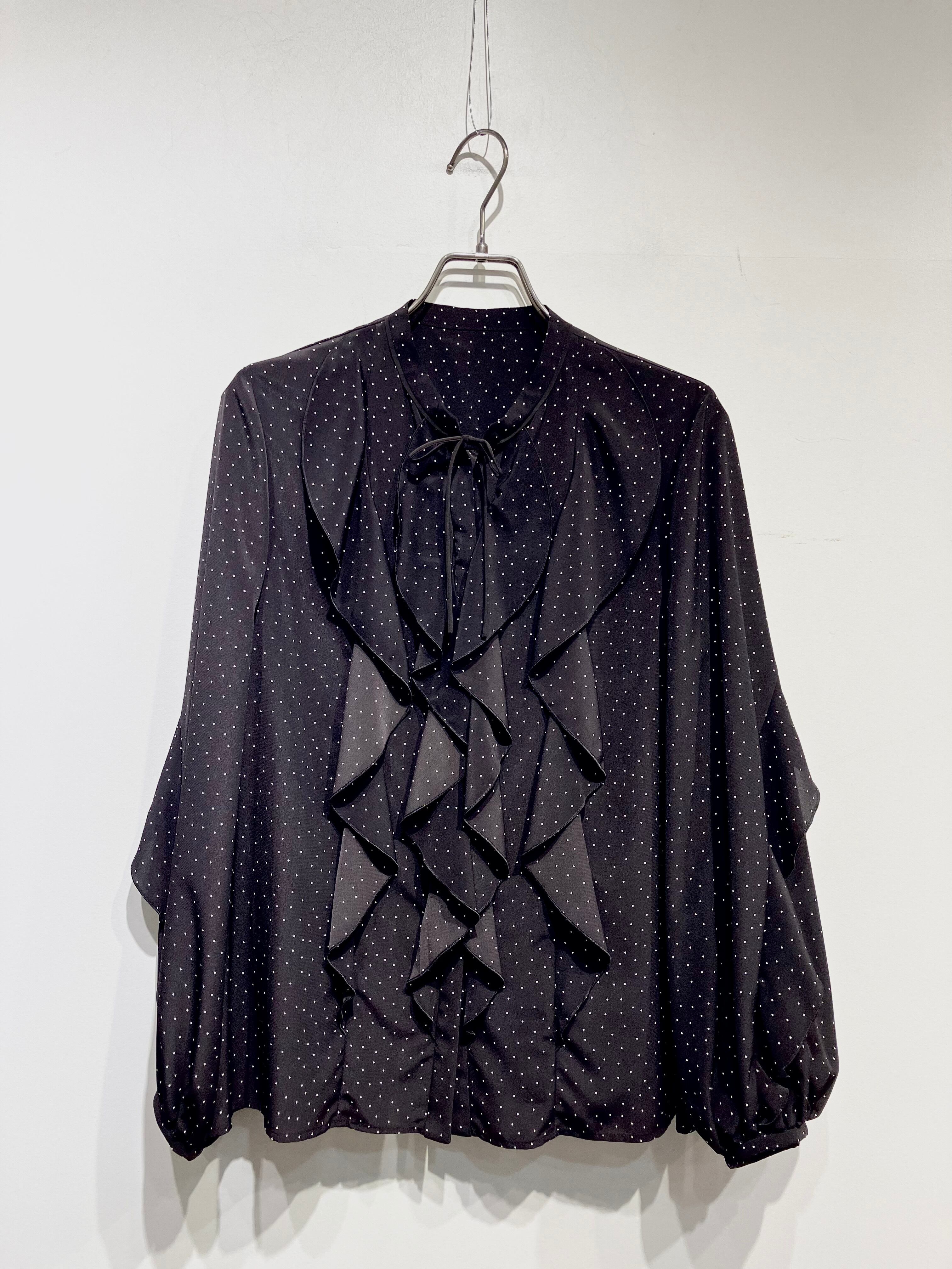 繊細なドット柄と大胆なフリルが絶妙にマッチした、クラシカルで女性らしいブラウス。