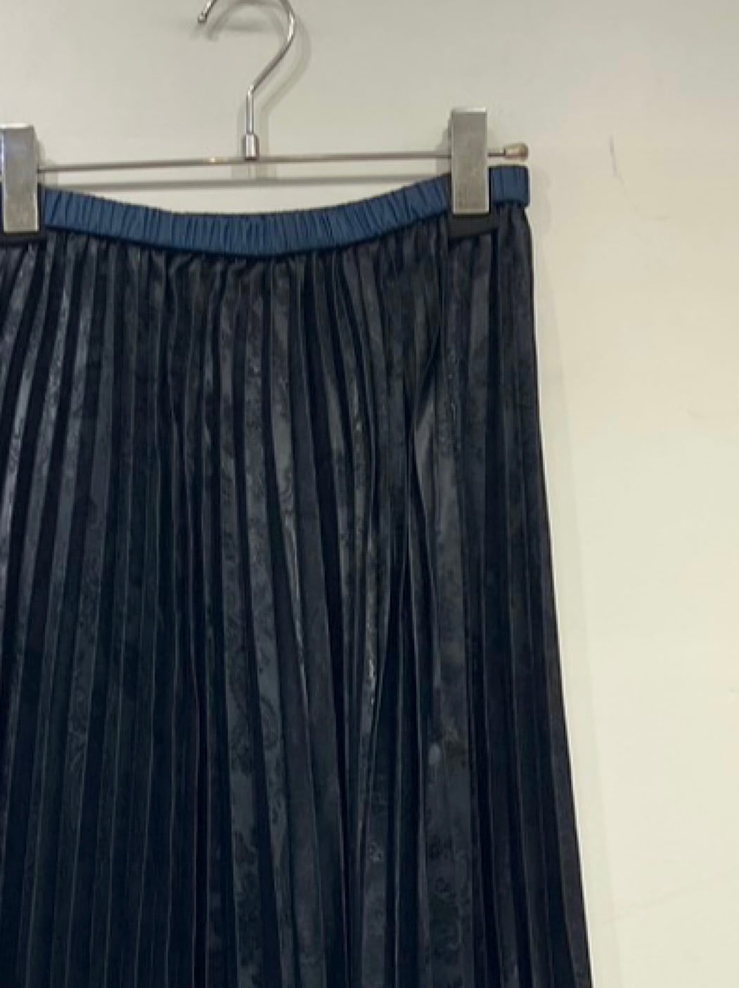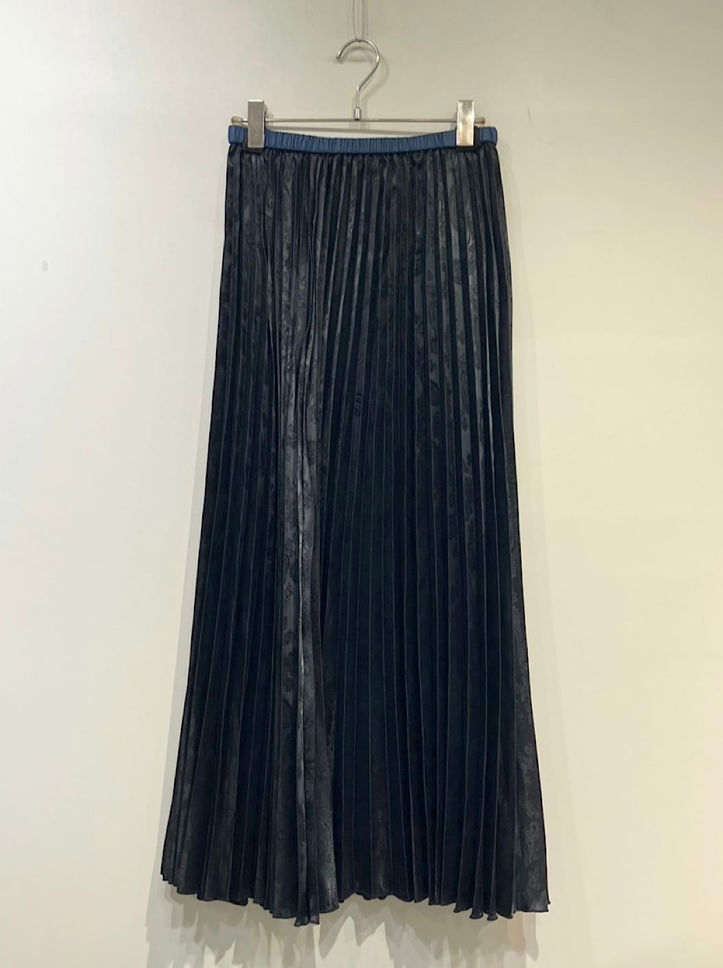 織りで繊細なペイズリー柄を表現した、上品なジャガードサテン素材のプリーツスカート。遠目には無地に見える控えめな柄で、さりげない高級感を演出します。