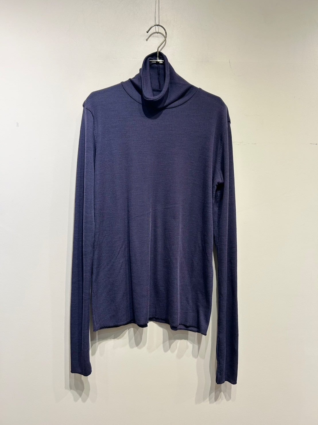 柔らかく伸縮性のあるリブ素材で仕立てた、シンプルなタートルネックカットソー。