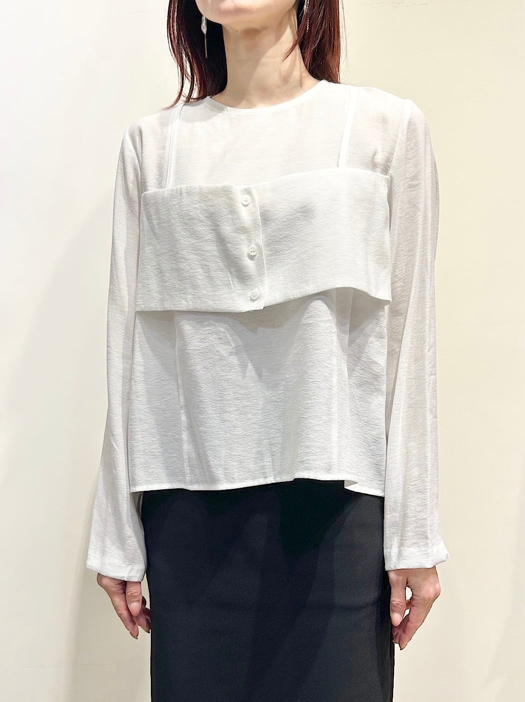 一枚でレイヤードスタイルが完成する、ビスチェ付きのドッキングシャツ。