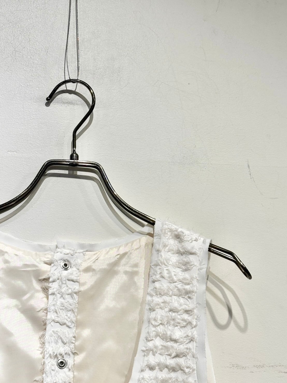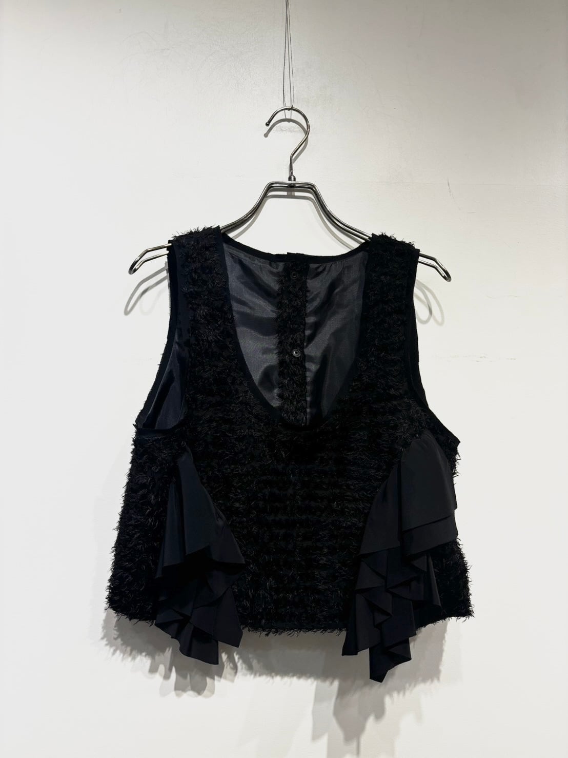 サイドについたラッフルがスレンダー効果とモードな華やかさを演出するクロップトジレ。