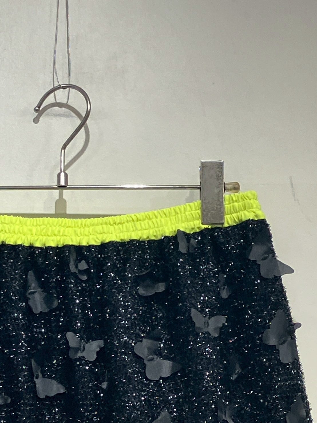 ウエストのゴム部分と裏地を裾で切り替えて蛍光イエローにしています。