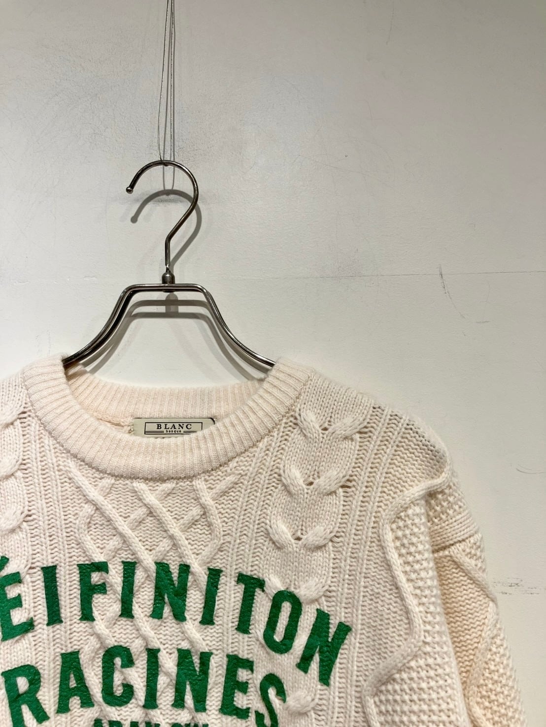 立体感のあるケーブル編みと、フロントのプリントデザインがアクセントになっています。