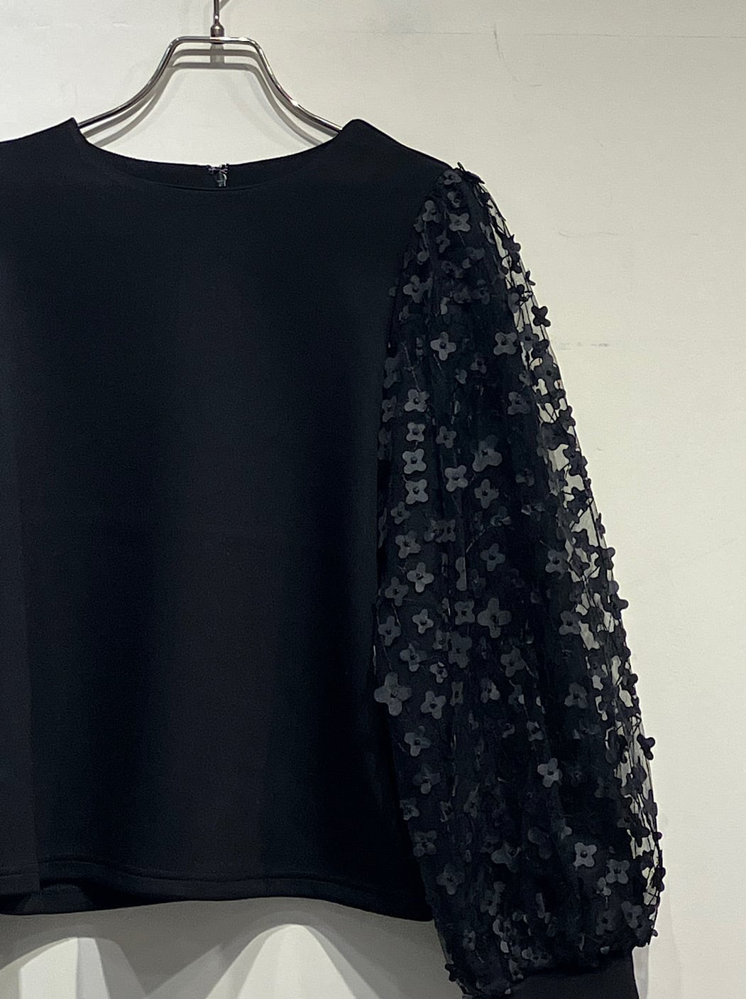 袖にふわりと重ねられたチュールには、刺繍や異素材のフラワーモチーフが散りばめられ、動くたびにさり気なく華やぎを添えてくれます。