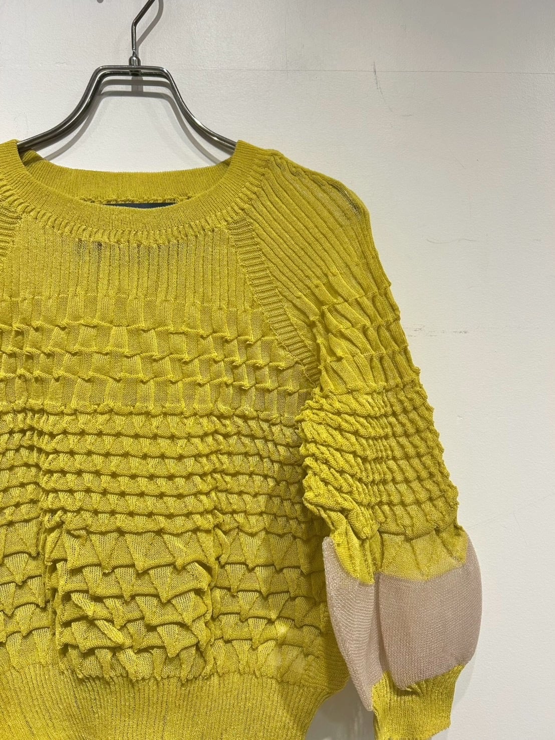 袖には軽やかなシアー素材を合わせ、ニットの重厚感と透け感のバランスを絶妙にコントロール。