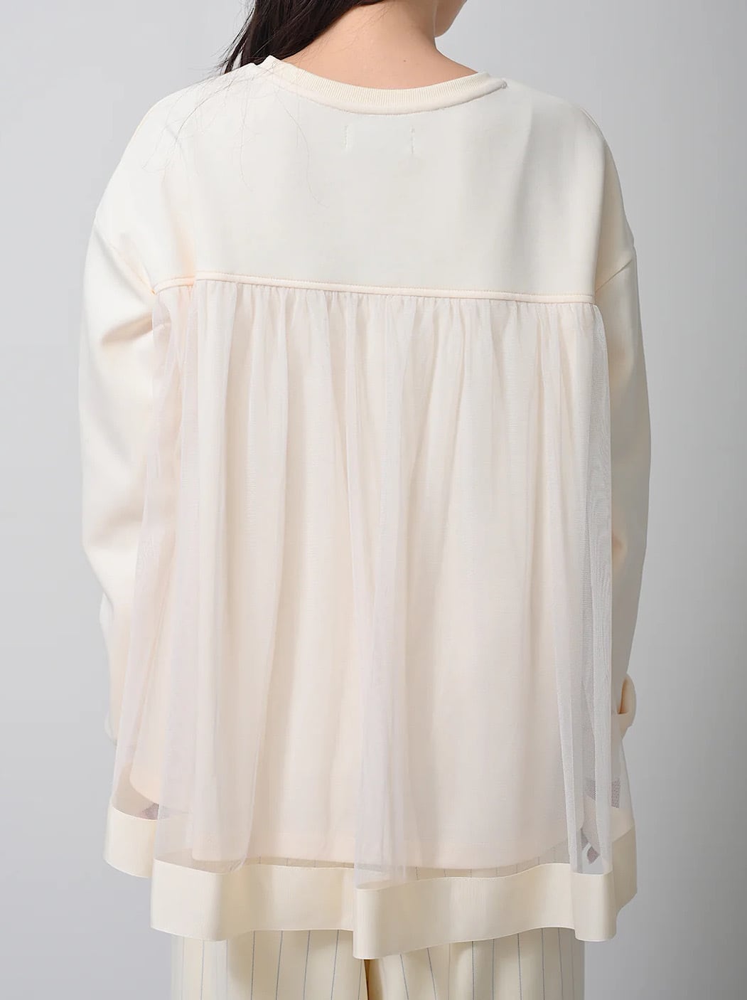 シンプルなフロントから一転、背中にはチュール切替を施し、後ろ姿まで印象的なデザインに仕上げました。動くたびにふんわりと広がる立体感が、軽やかで女性らしい表情を演出します。
