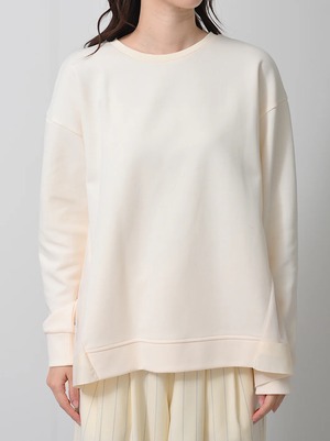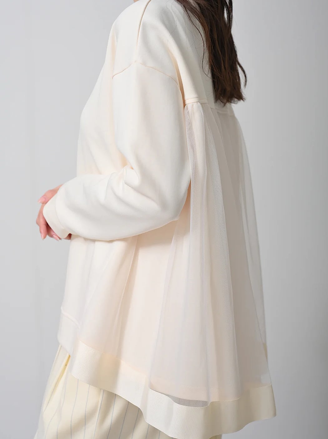 ゆったりとした身幅で体のラインを拾いにくく、リラックス感のある着心地も魅力。裾にはグログランテープをあしらい、カジュアルになりすぎない上品さをプラスしました。表地には厚手のコットン混素材を使用し、なめらかな肌触りと適度なハリ感を両立。軽やかな透け感のチュールが華やかさを添え、デイリーコーデにさりげない特別感を与えてくれるアイテムです。