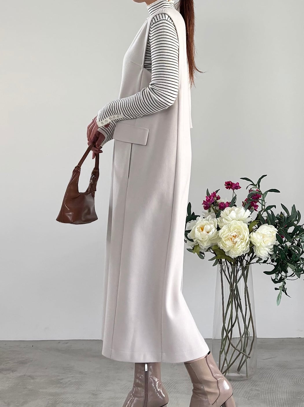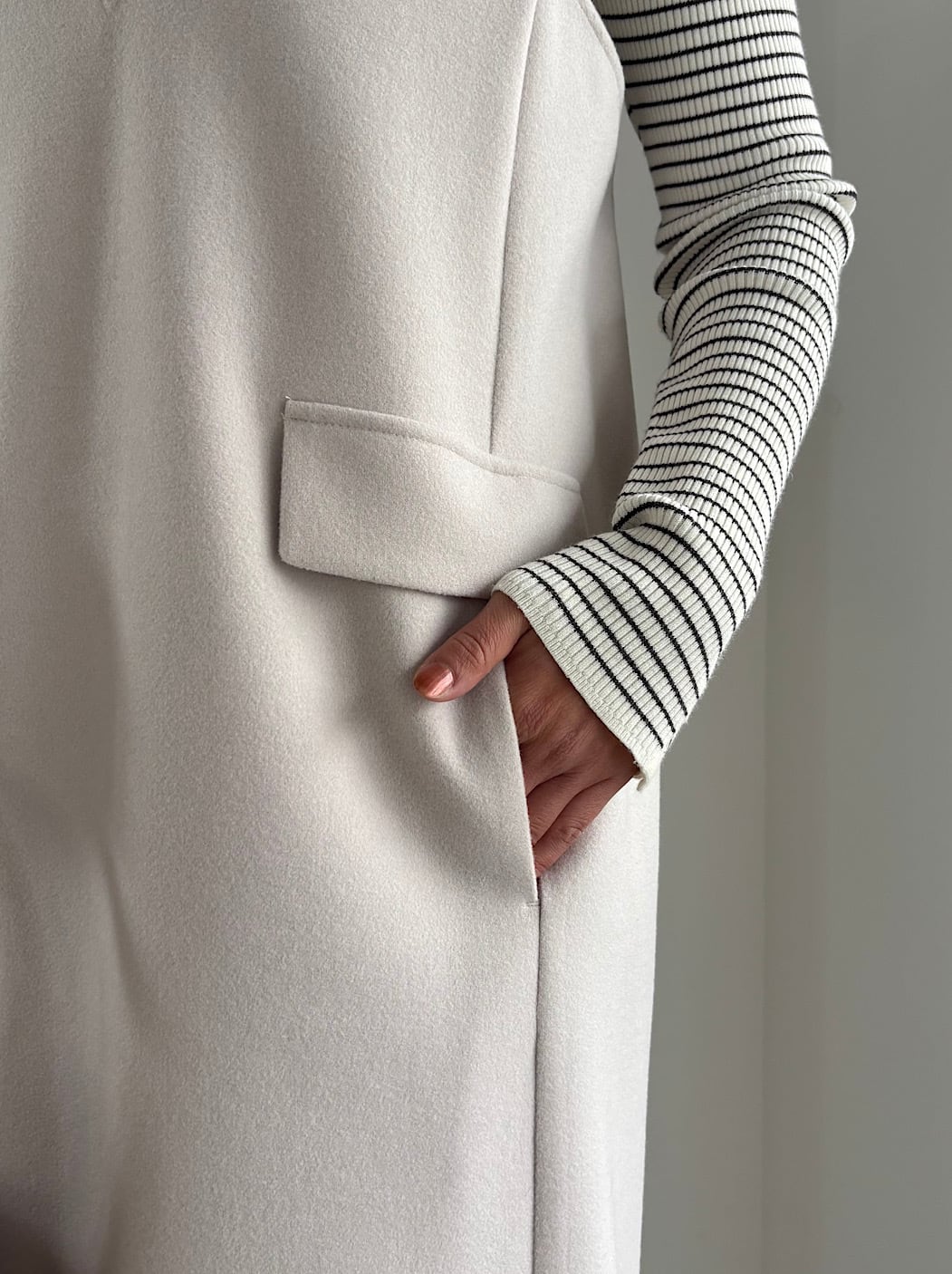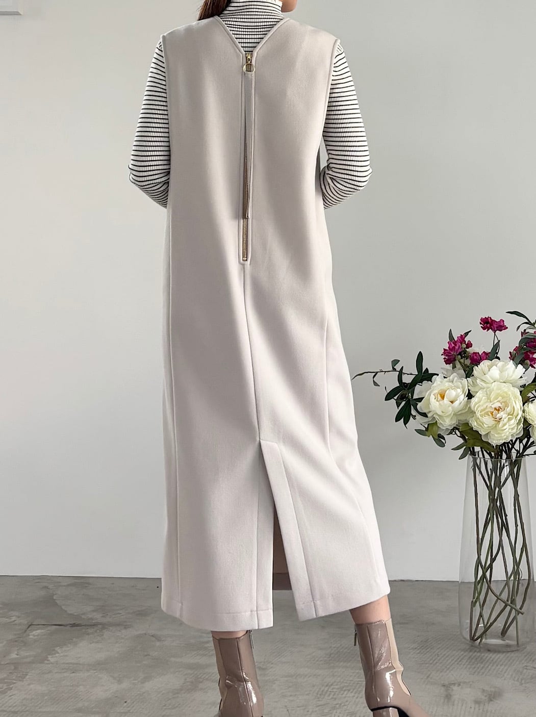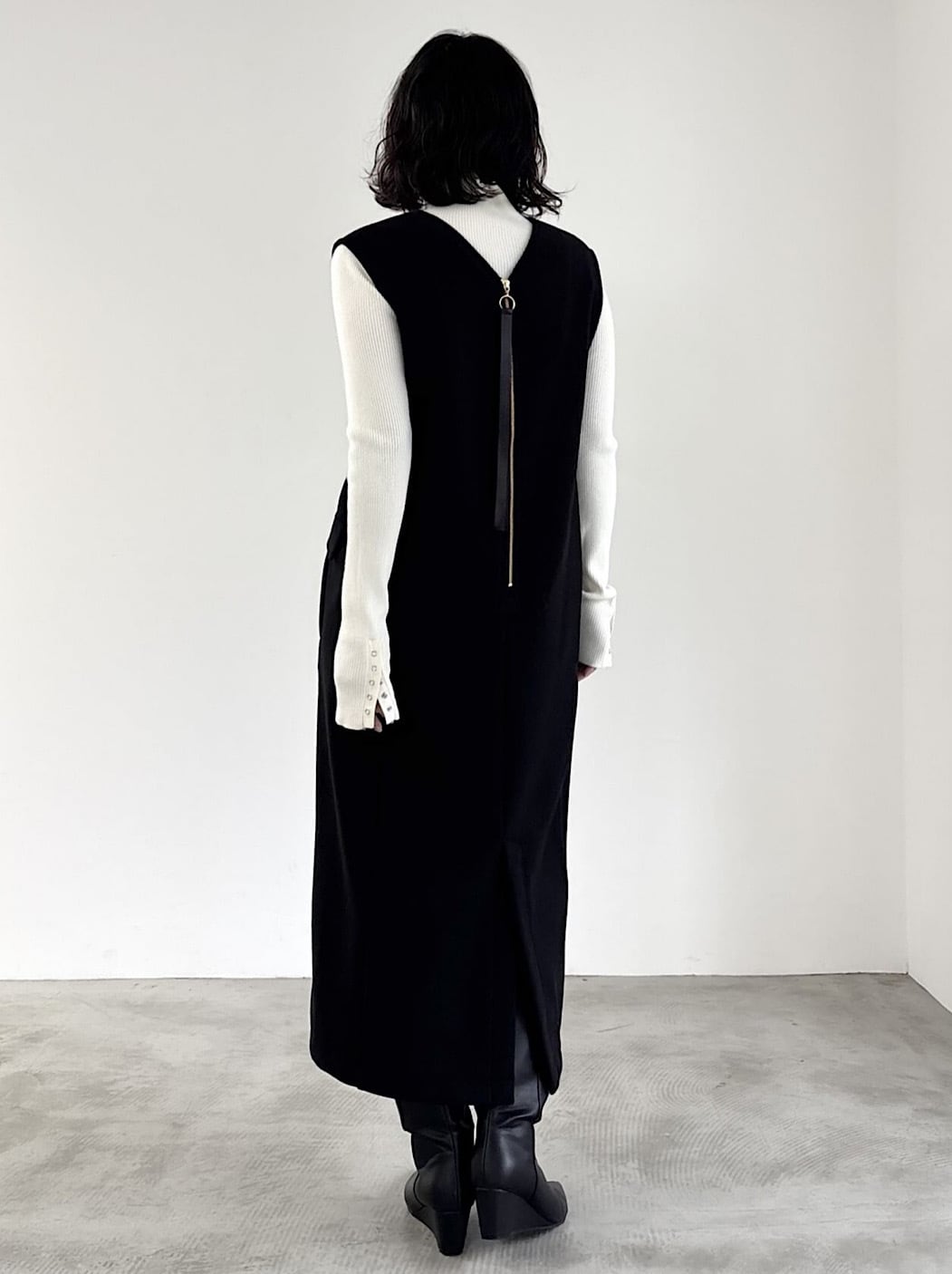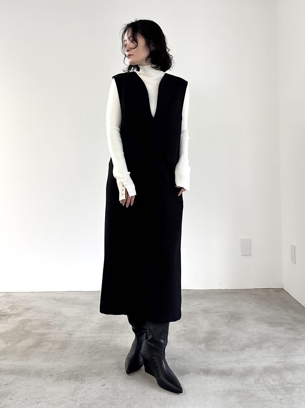 リアルなウールの高級感と風合いを表現した、軽くて着心地の良いストレッチジャージ素材のジャンパースカート。とても動きやすく、ちくちくしないのでストレスフリーに着用できます。ボックスシルエットでボディラインは拾わず、ゆるくカーブした変形のVネックがすっきりした印象を与えてくれます。