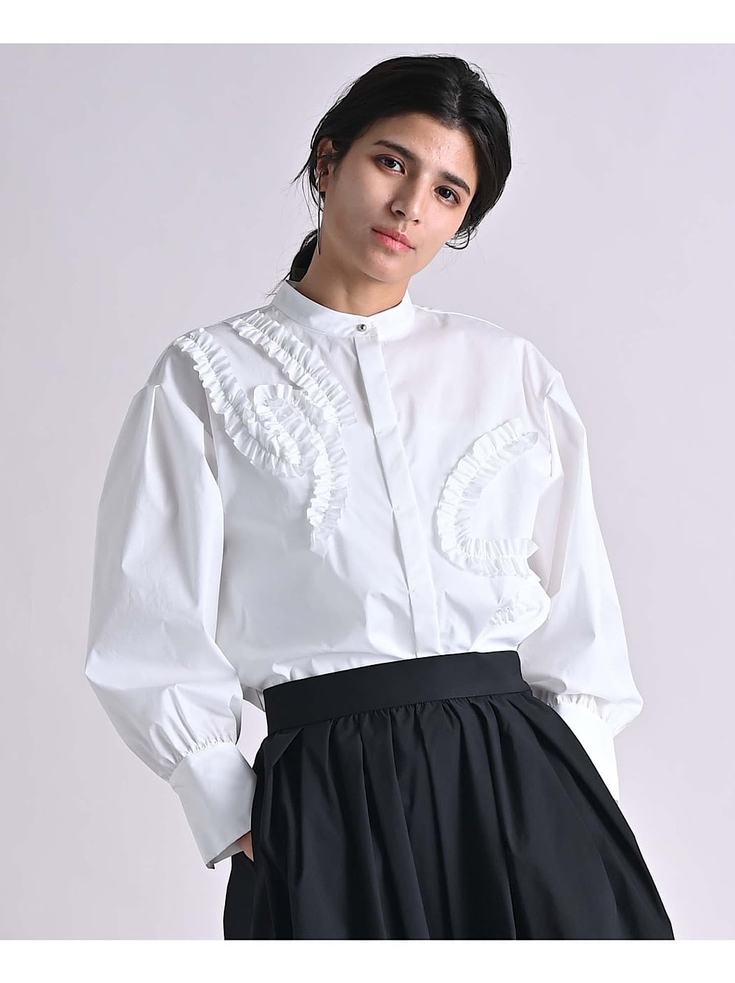 フリルディテールが、シャープなシャツにモードな表情をプラス。