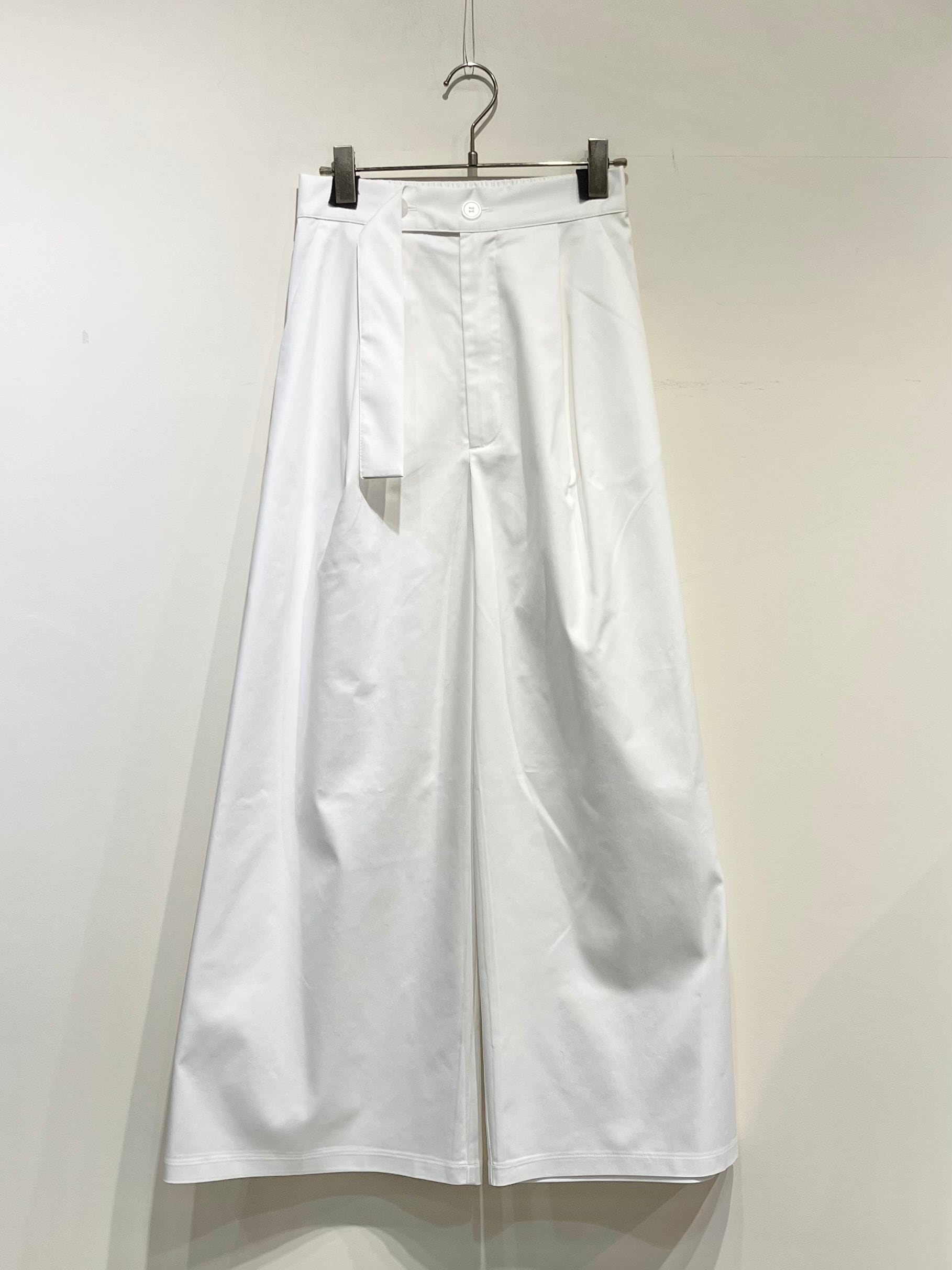 オーバーベルトデザインが目を惹く、ツイル素材のワイドパンツ。スタイリングのアクセントになりつつ、全体はすっきりとした印象に仕上げています。きれいめなトップスと合わせれば上品に、カジュアルなアイテムと合わせれば程よくラフに。オンオフ問わず活躍し、着回し力の高さが魅力の一本です。