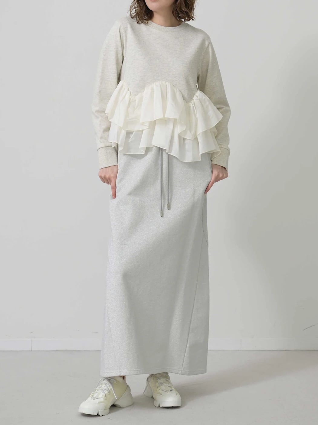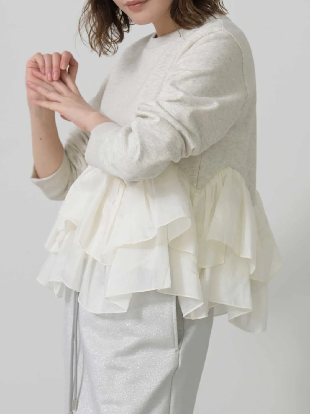 カットソーに異素材フリルを組み合わせたデザインで、ウエスト位置に切り替えを入れることで自然な立体感を演出します。