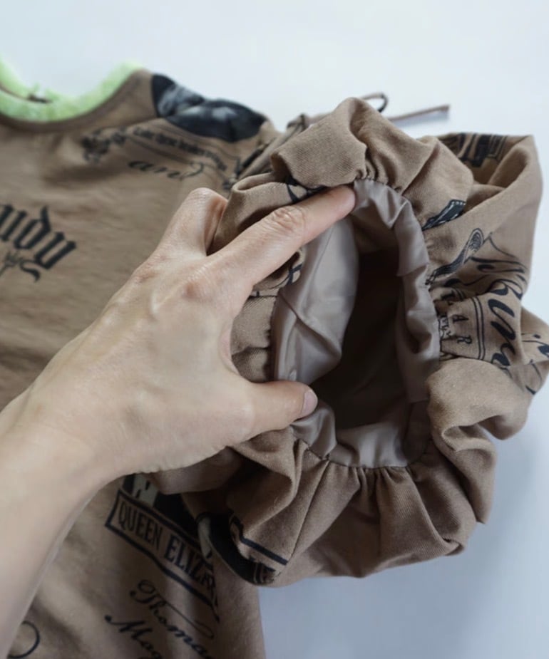 パフスリーブで膨らむ袖がとても可愛らしい雰囲気です。サイズはかなり大きめですが、細身の方もふっくらされている方も、しっくり着る事が出来ます。袖は落ち気味になっているので、下部で膨らみができ、可愛すぎる事なく、大人っぽいシルエットにしました。
