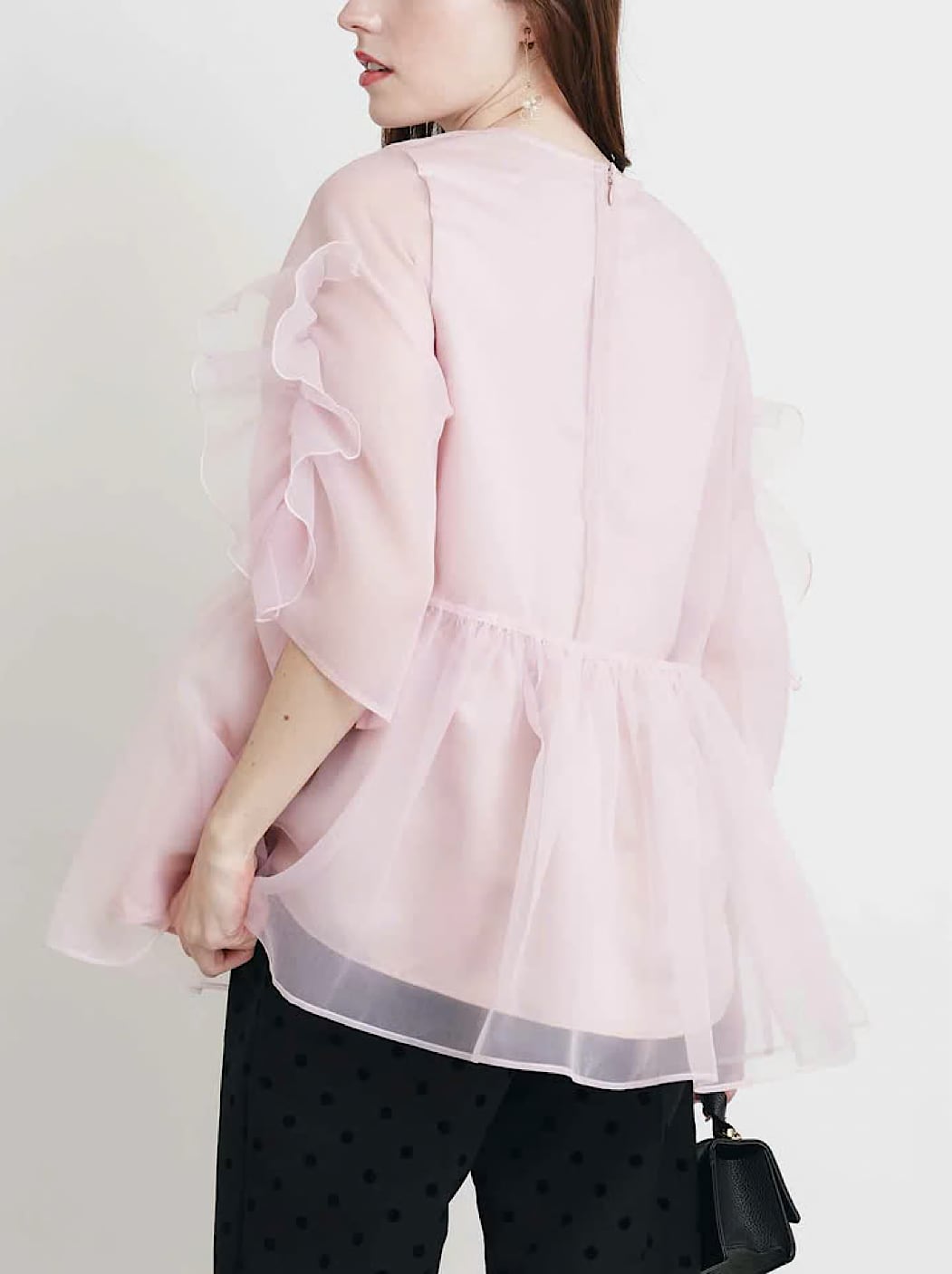 裏地のない袖は涼し気で、ギャザーやフリルが動くたびにひらっと揺れるエアリーな表情をプラス。
