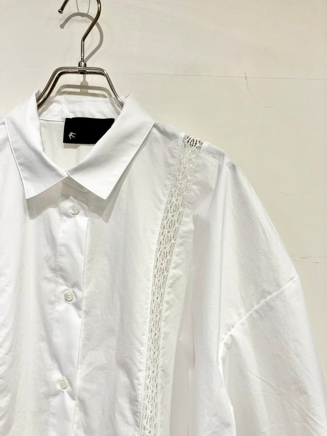 フロントと裾、袖口に施されたレースが、シンプルな中にも女性らしい華やかさをプラスします。