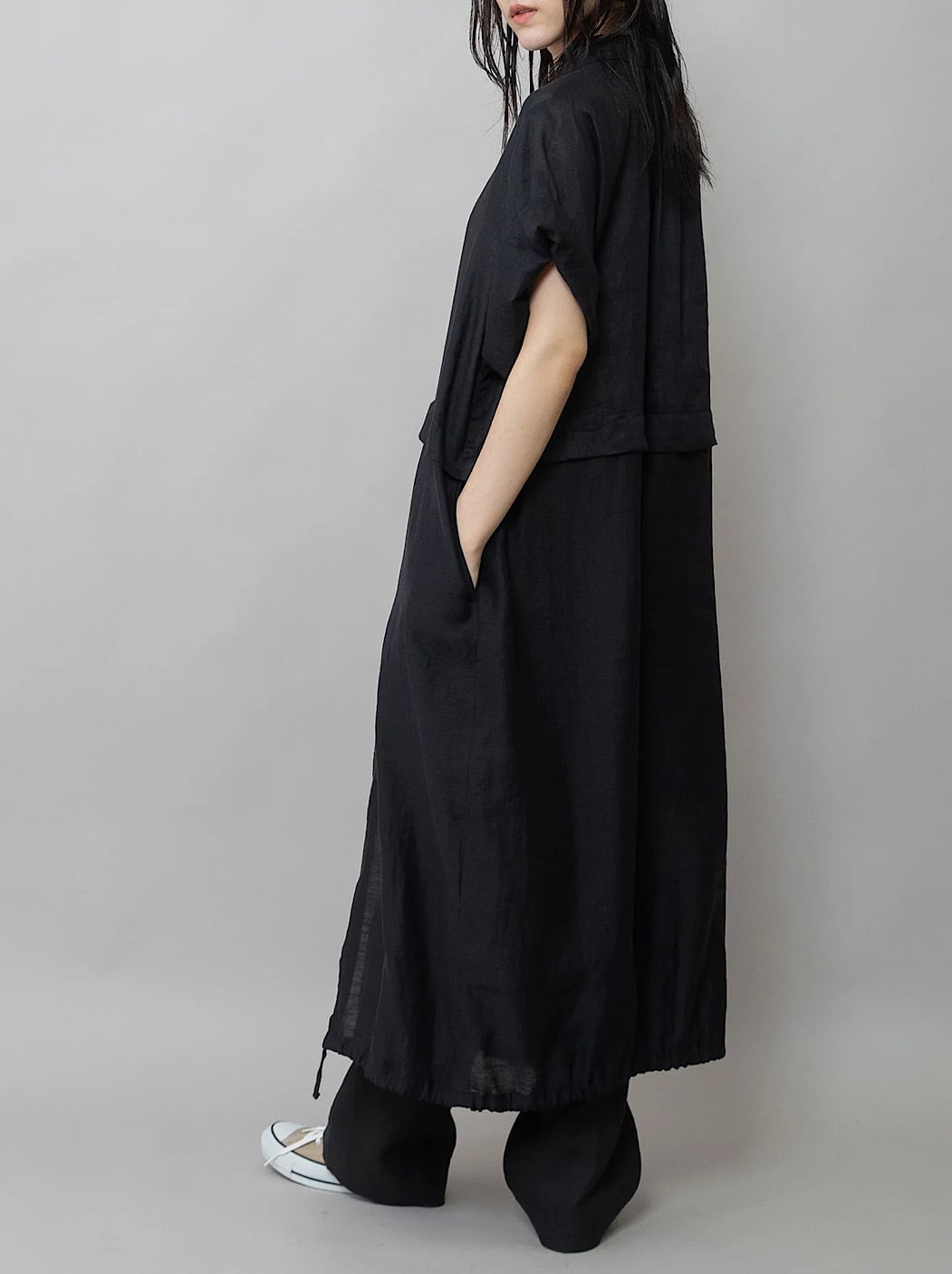 異素材で切り替えたデザインとゆったりとしたシルエットが特徴で、裾のコードを絞れば女性らしいふんわりシルエットに。ワンピースとしてはもちろん、パンツ合わせやロング羽織としても活躍する一着です。