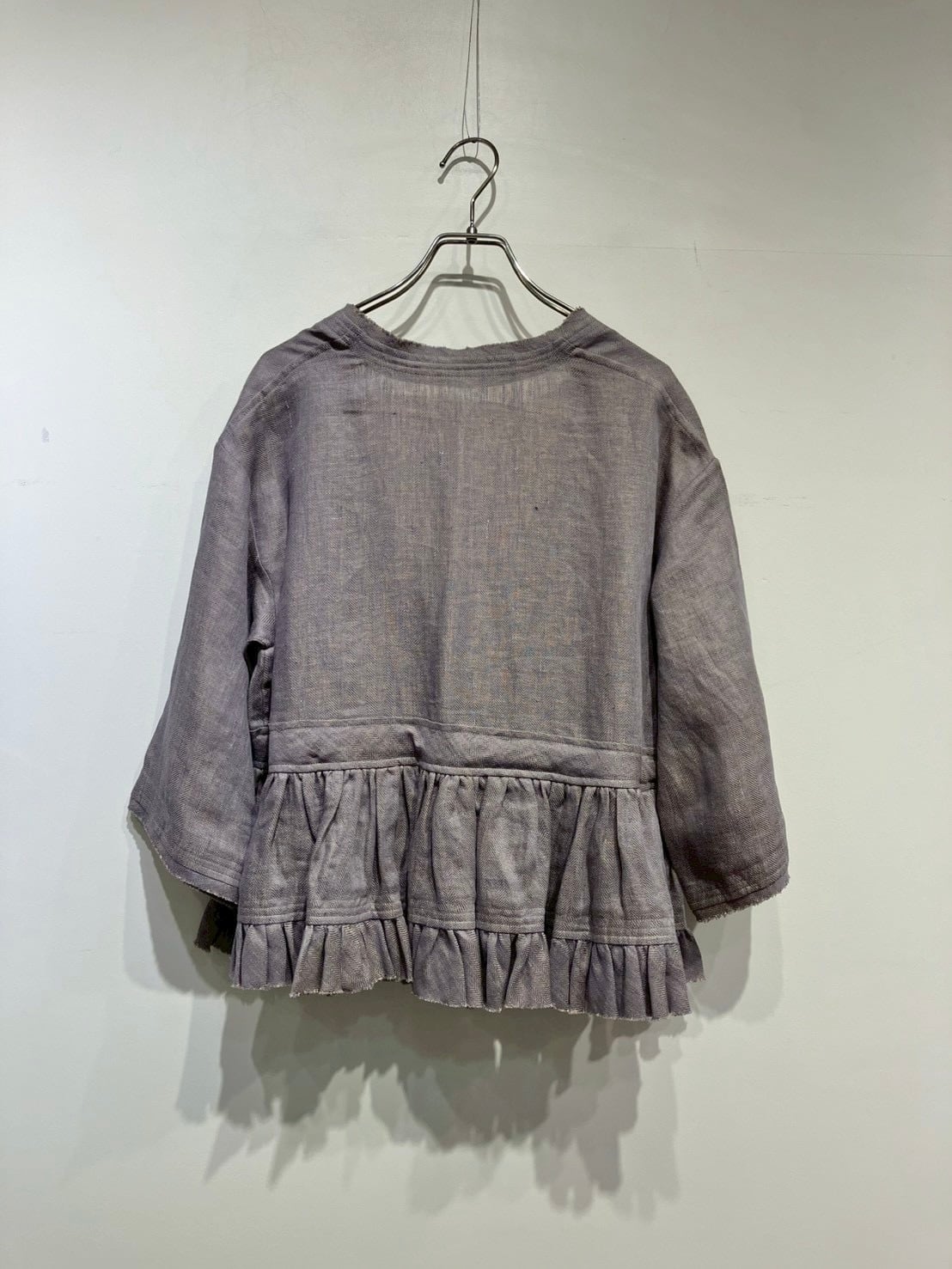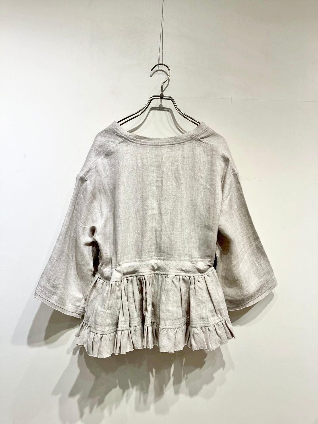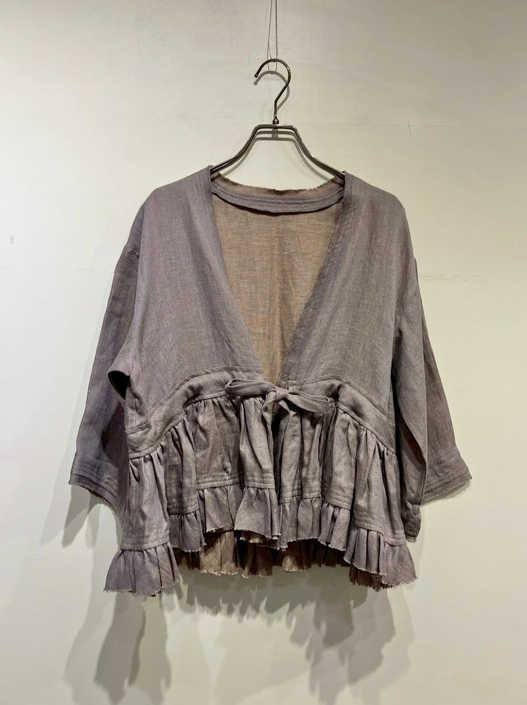 切りっぱなしにすることで素朴な雰囲気に仕上げ、裾のフリル部分にはたっぷりとギャザーを寄せています。