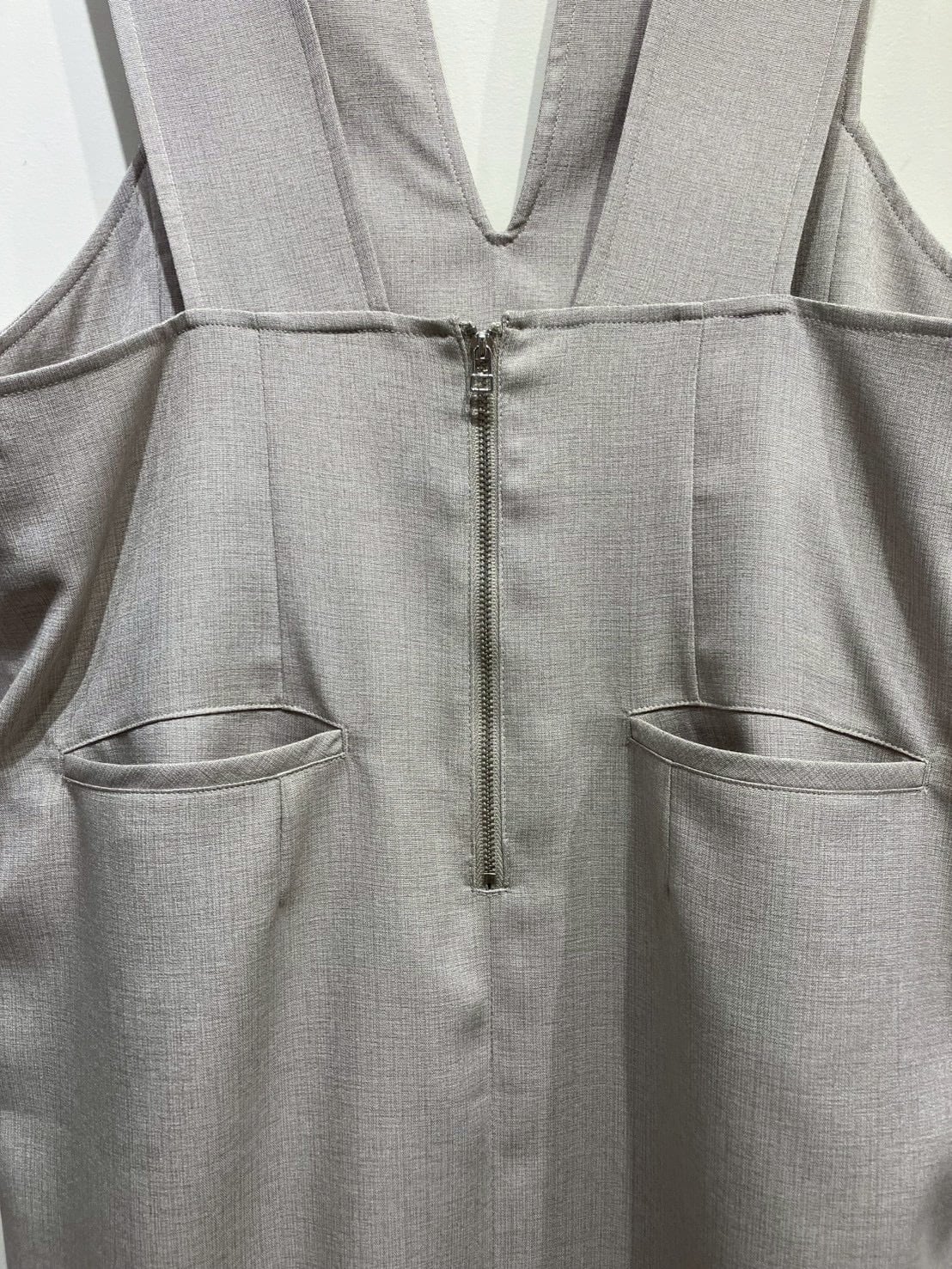 ゆるくカーブした変形のVネックが、すっきりした印象を与えてくれる軽量素材のジャンパースカート。