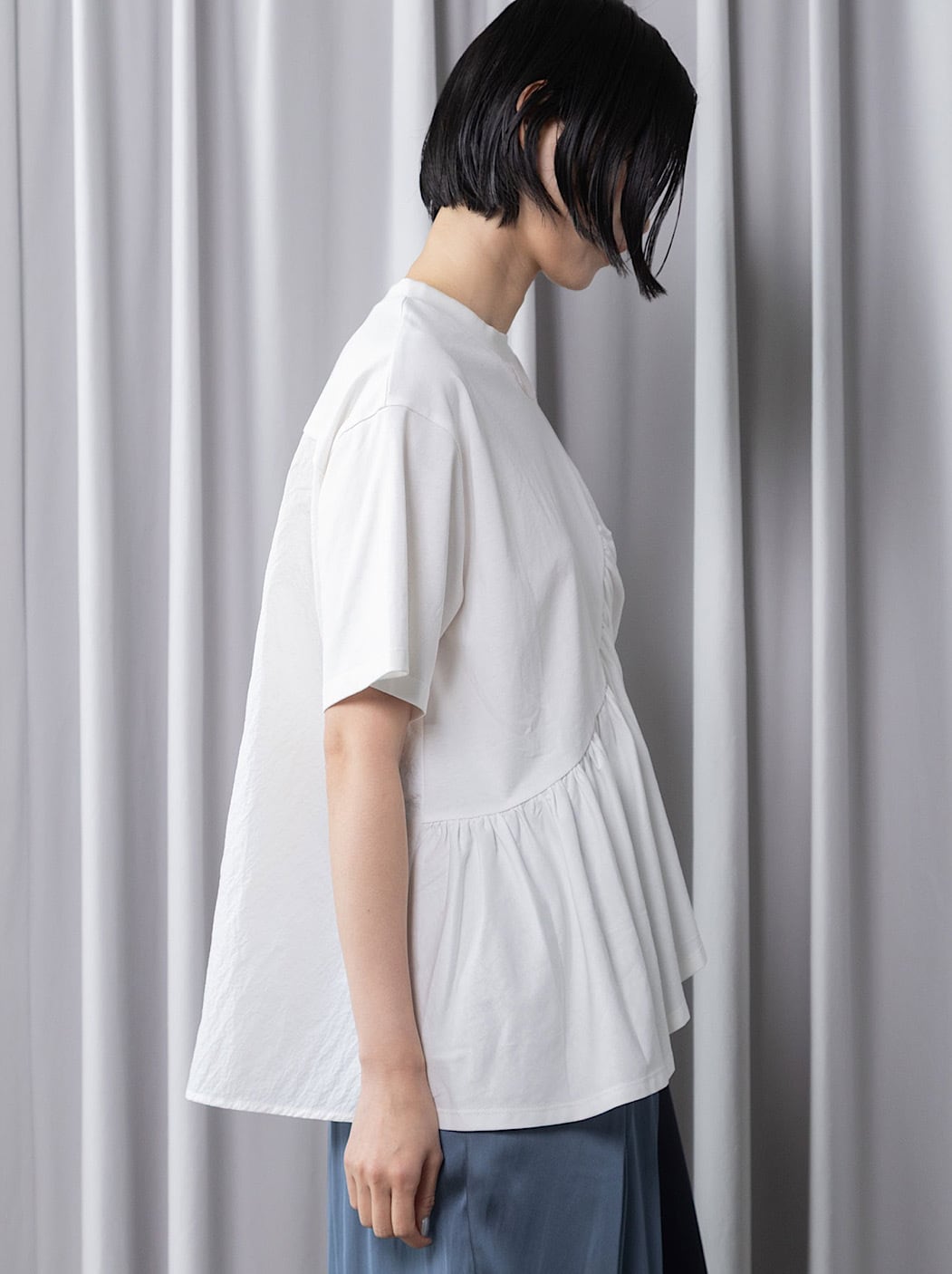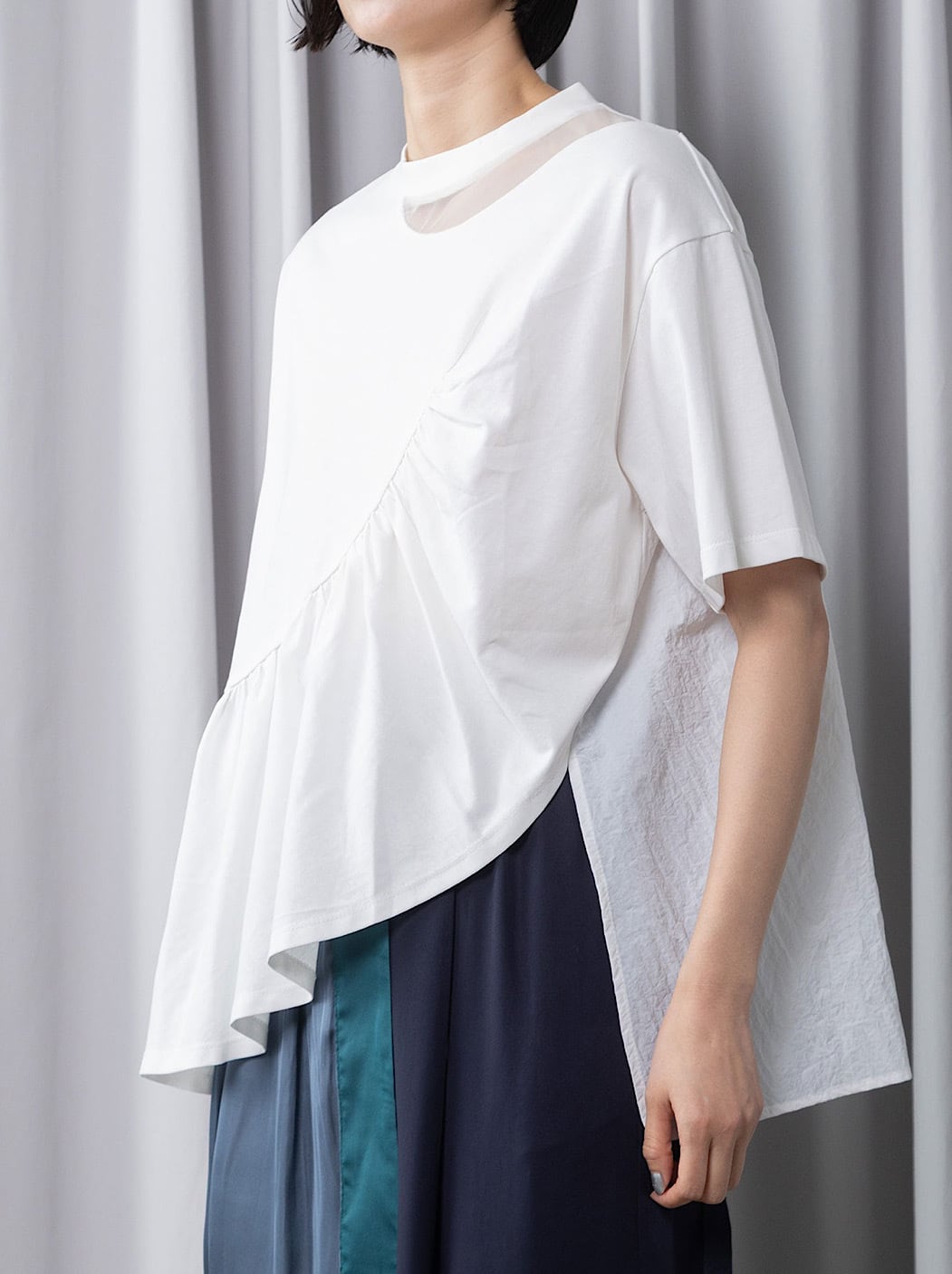カーブラインで切り替えた部分に寄せたギャザーが自然なドレープをつくり、角度によって表情が変わるデザイン。