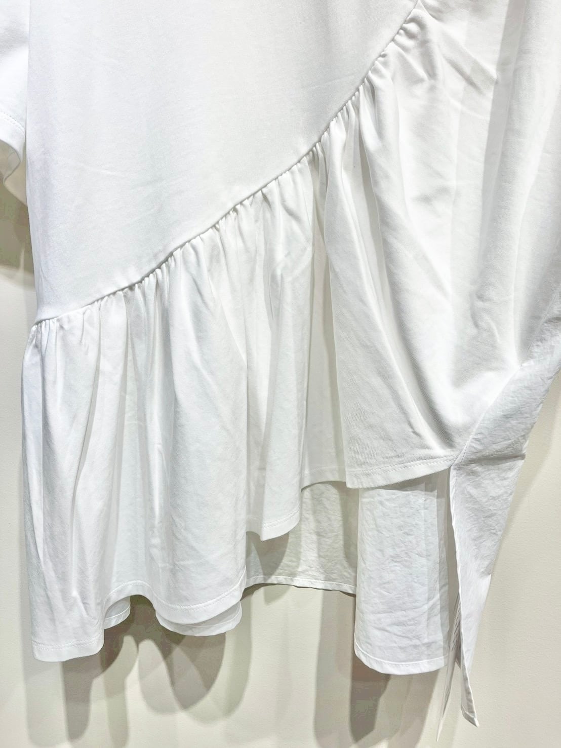 フロントの大胆なフリルが目を惹くデザイントップス。