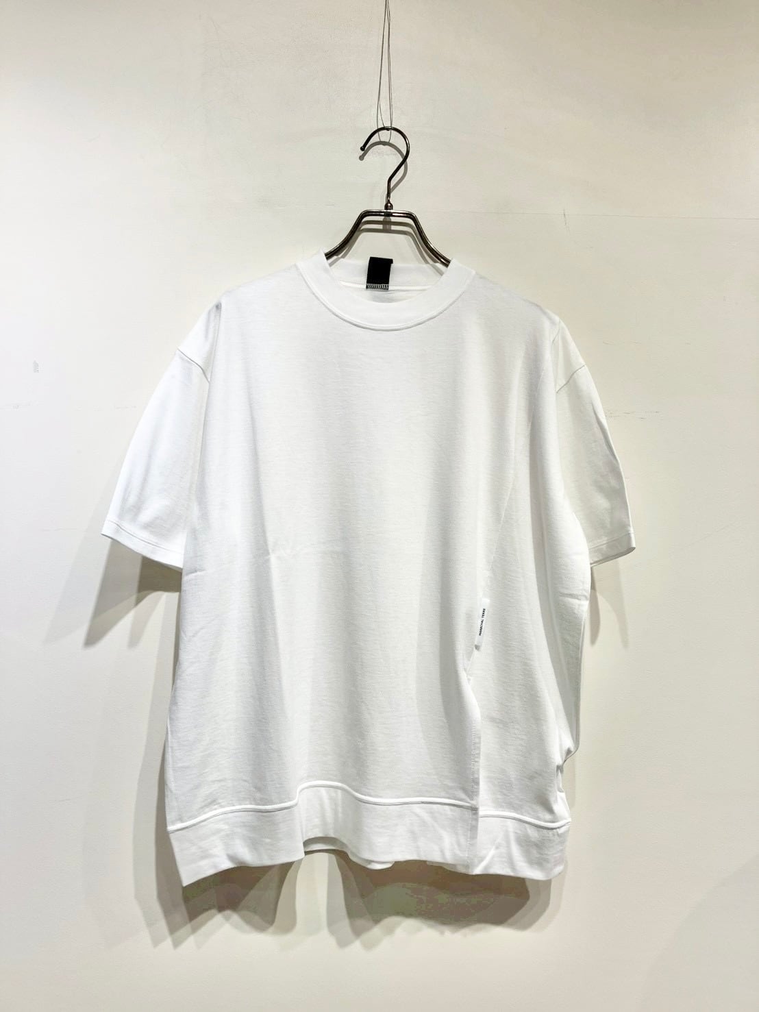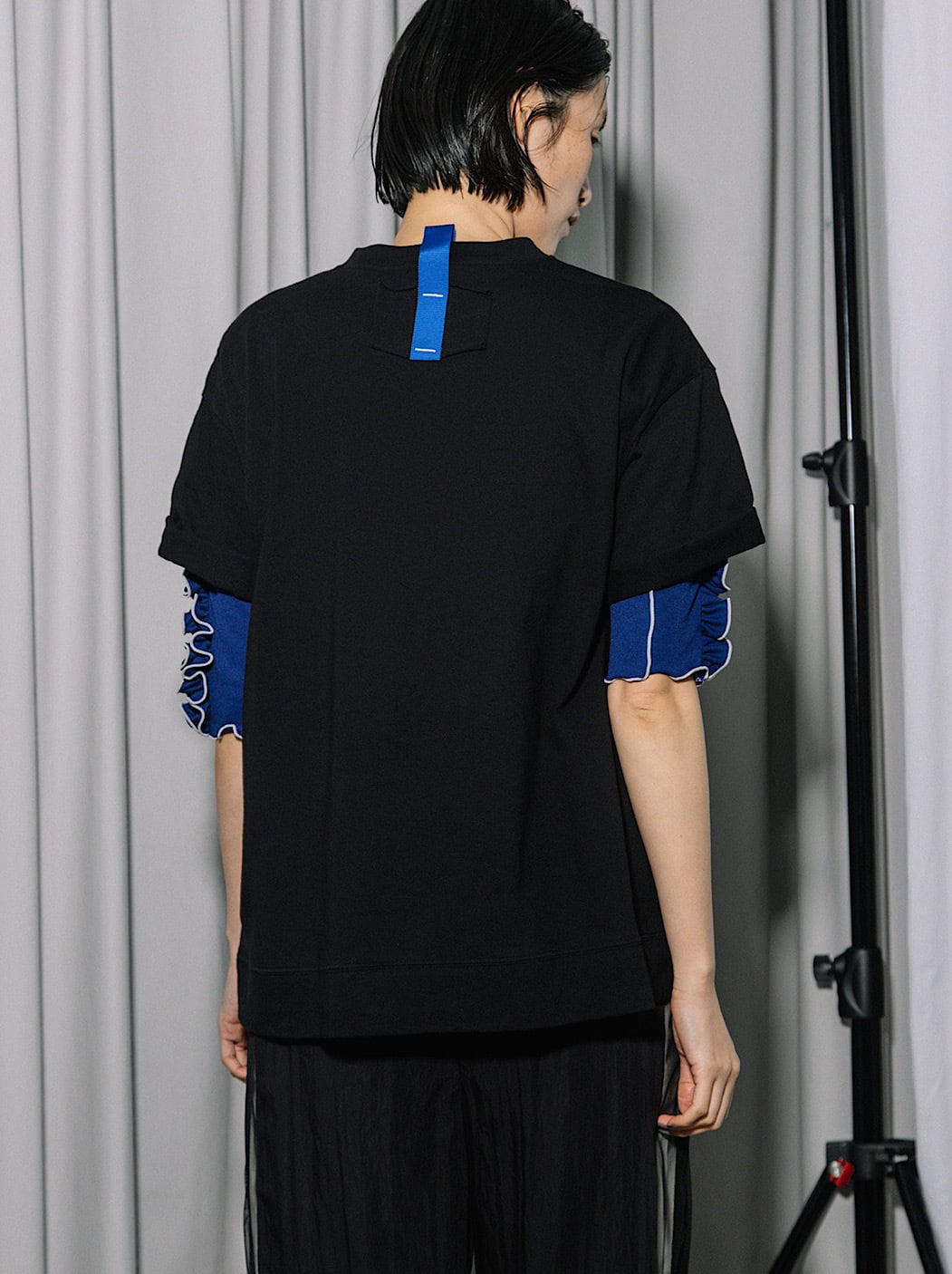 フロントはシンプルに、バックネックに配した配色カラーテープデザインでさりげないアクセントを添えたTシャツ。