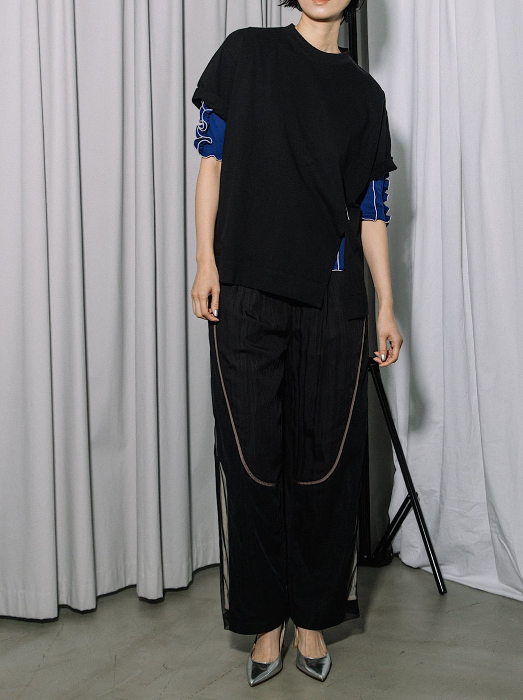 左裾のスリットが縦ラインを強調し、ボックスシルエットでも重たく見えないバランスに。