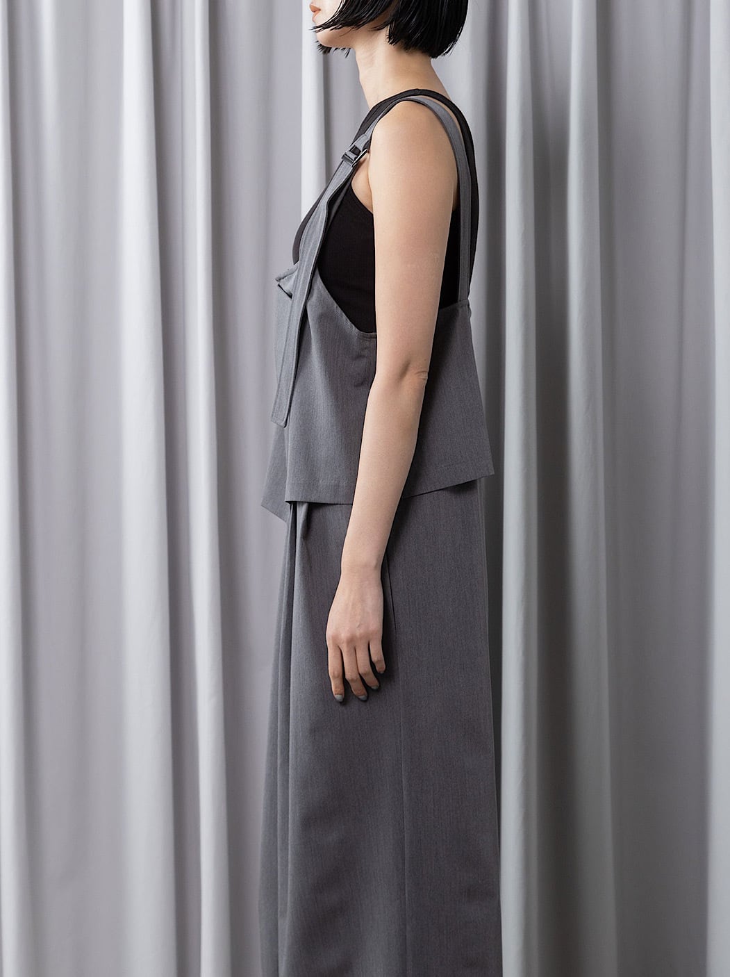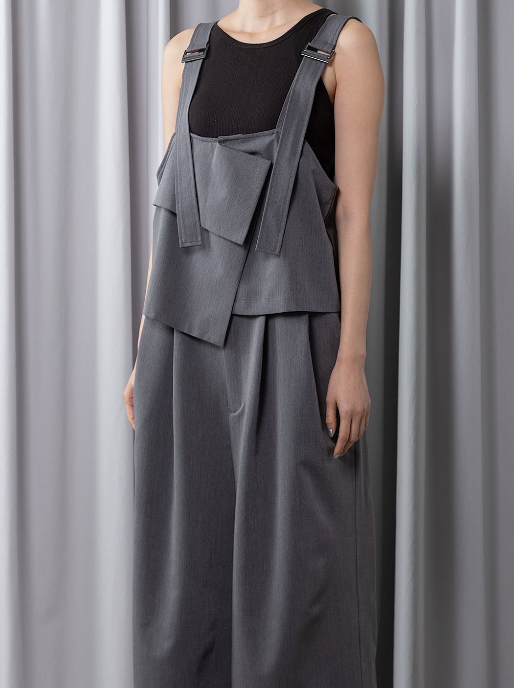 ベアトップキャミソール×タックワイドパンツを着たような、レイヤード風サロペット。