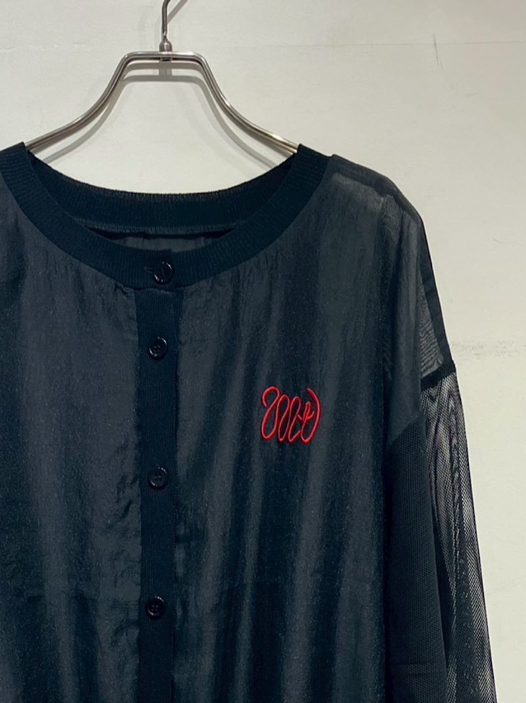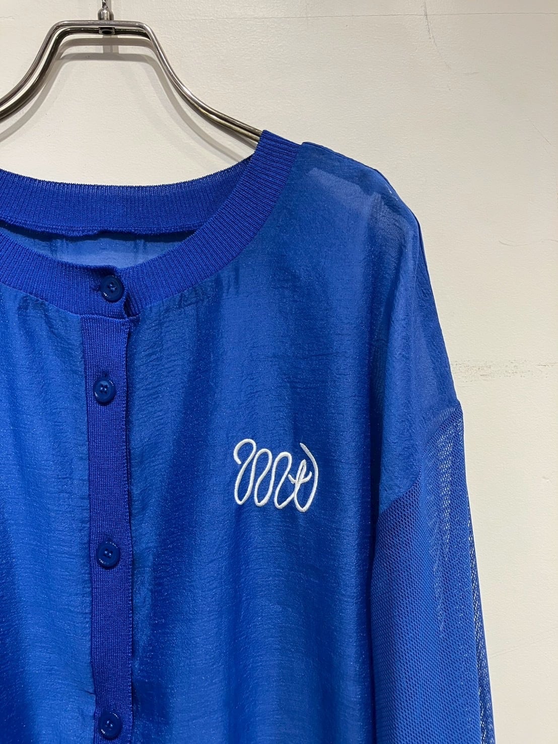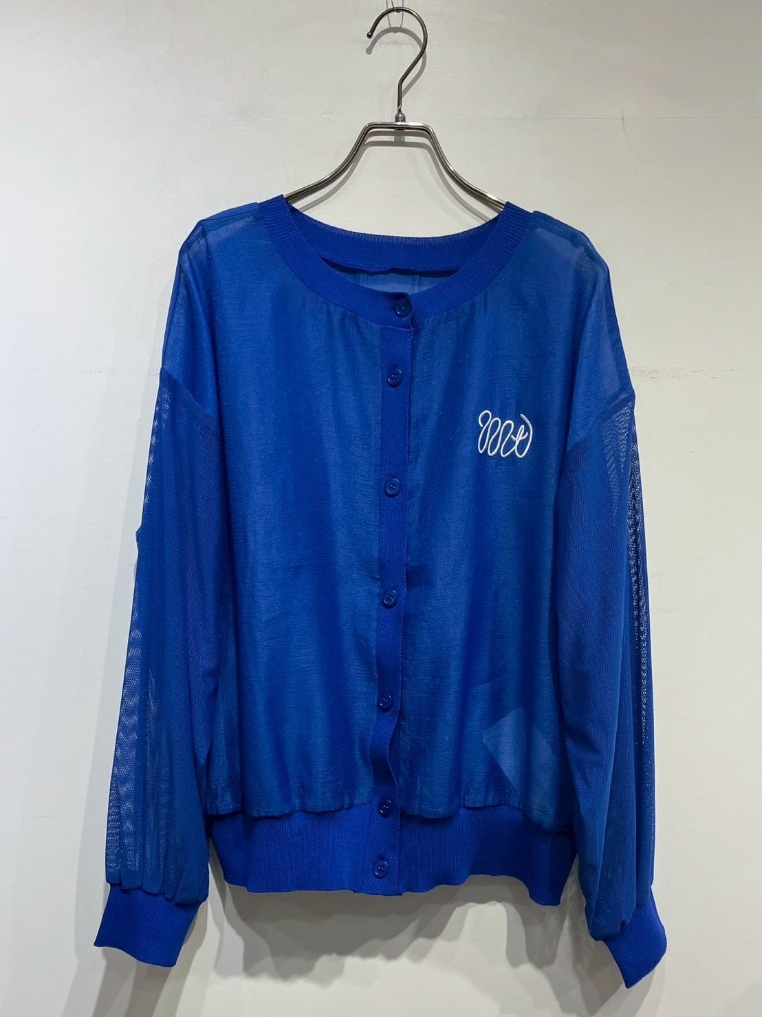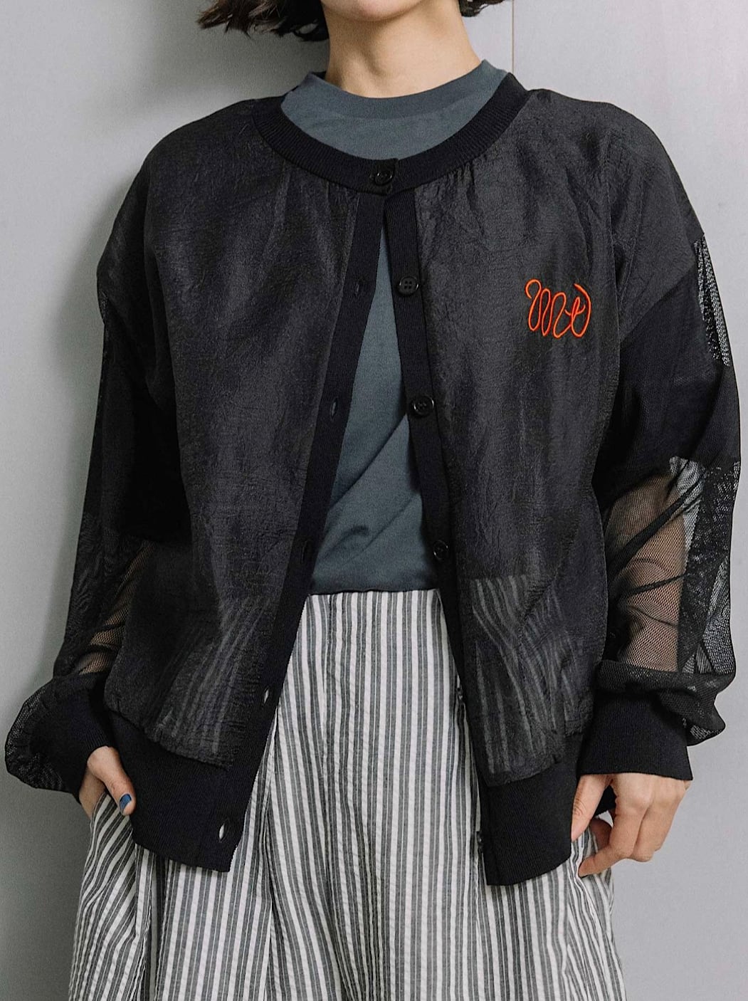 MTの配色刺繍がポイントのシアーカーディガン。