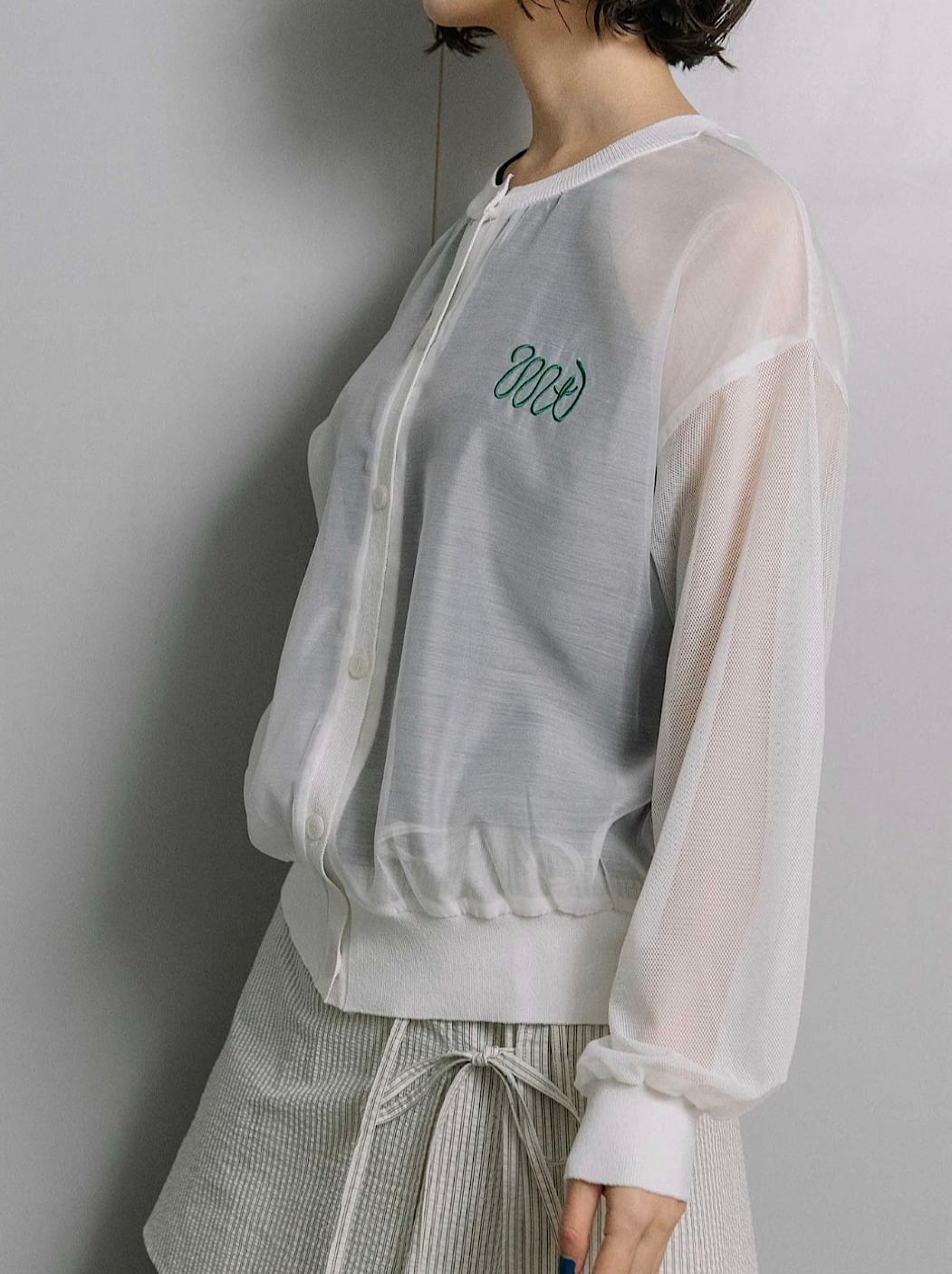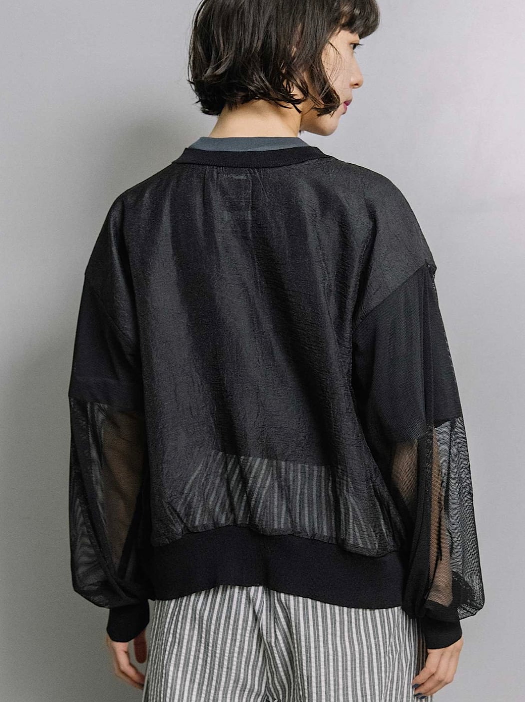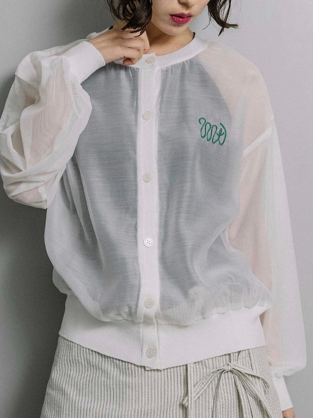 身頃・袖はほんのり透けるエアリーな素材、前立て・裾・袖口はニットで切り替え、上品さとカジュアルさを絶妙にミックス。
