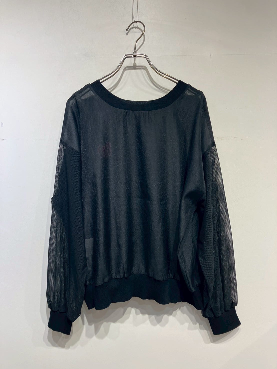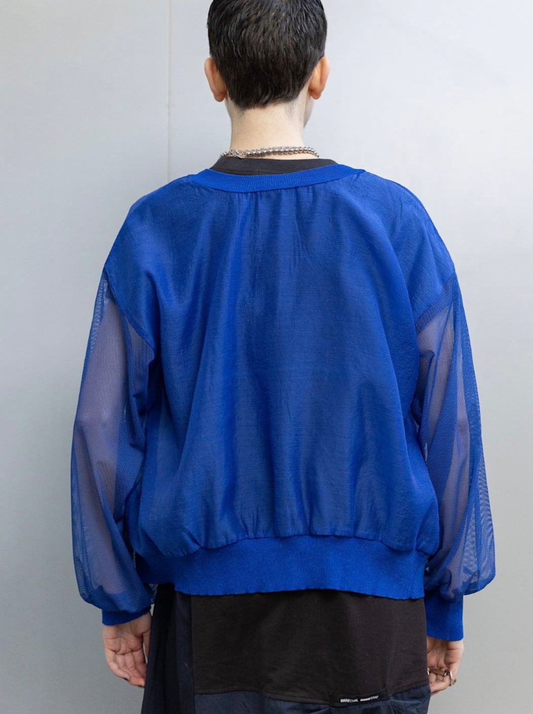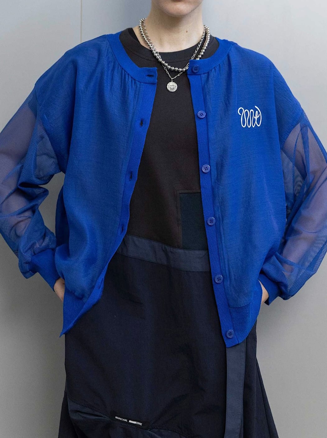 身頃・袖はほんのり透けるエアリーな素材、前立て・裾・袖口はニットで切り替え、上品さとカジュアルさを絶妙にミックス。