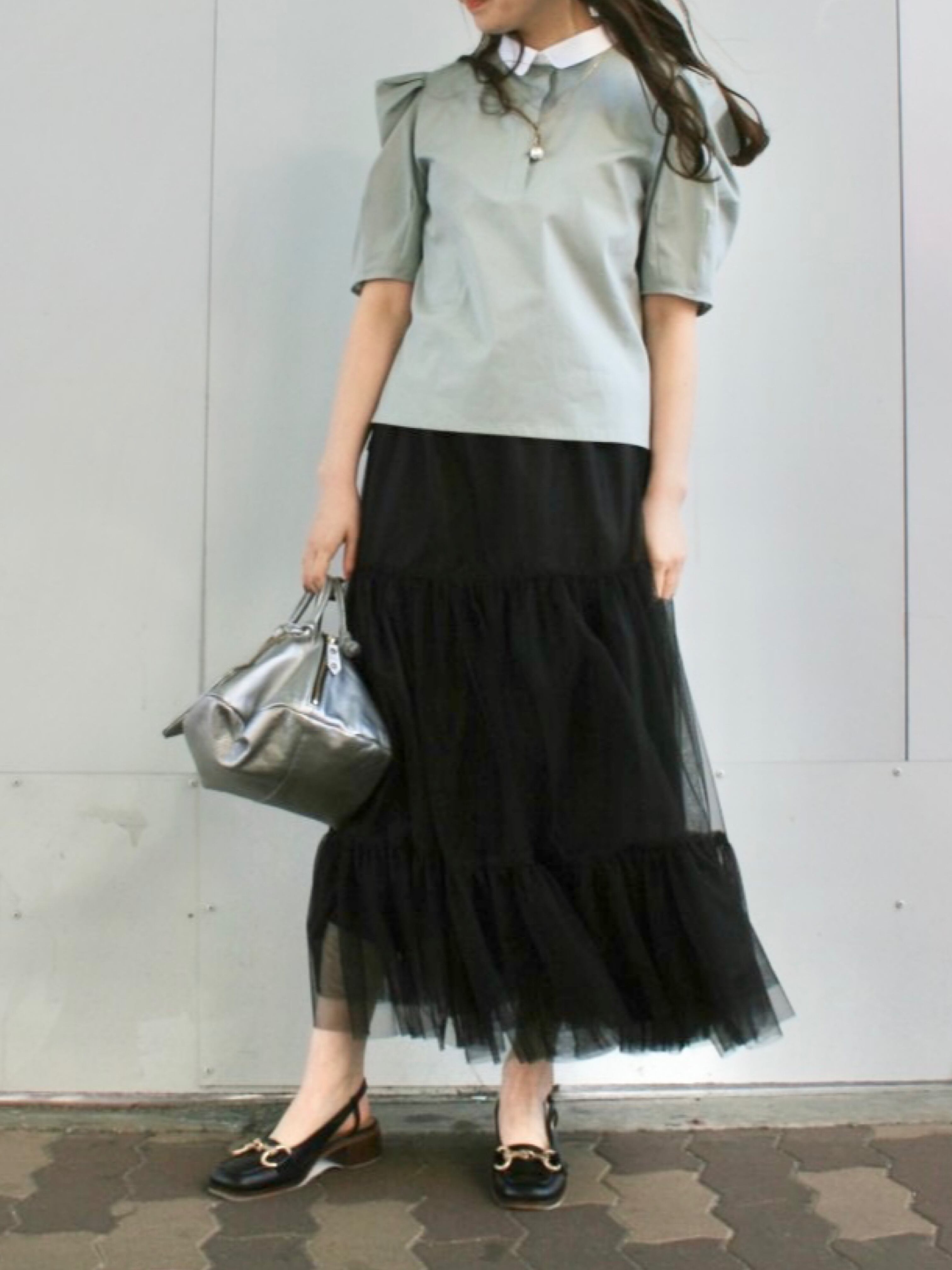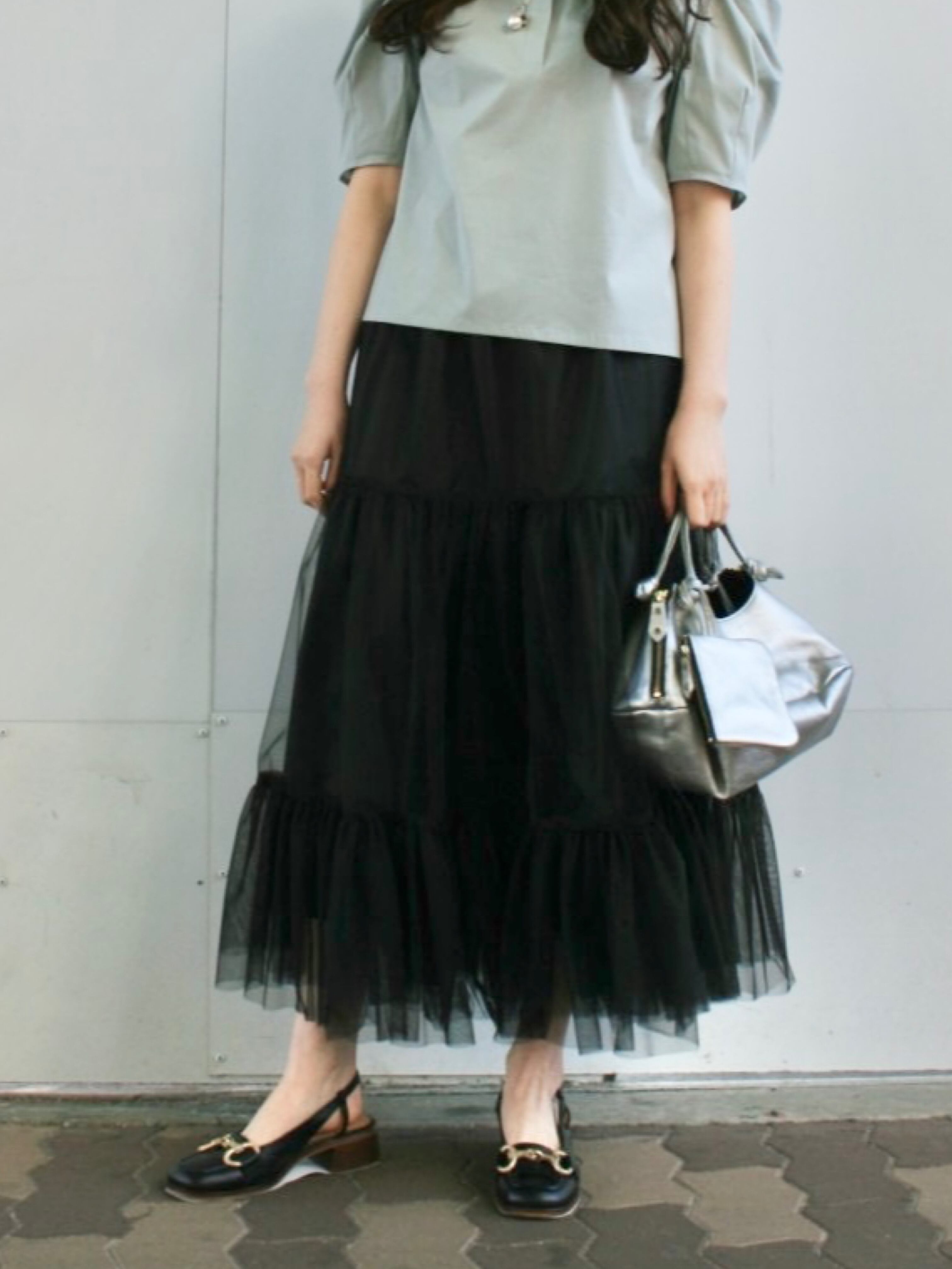 チュールの程よいボリューム感がレディライクなスタイリングにピッタリな1着。