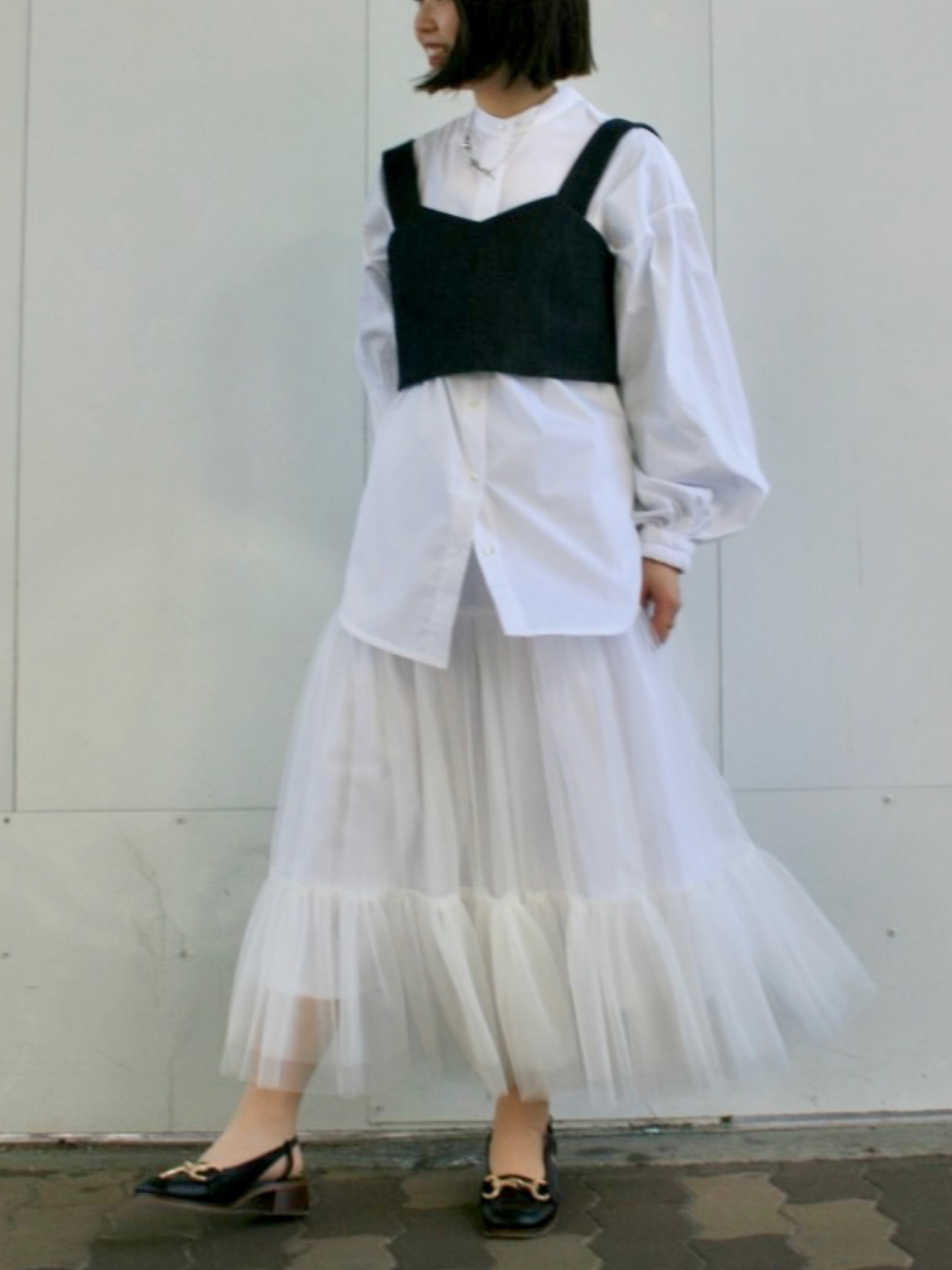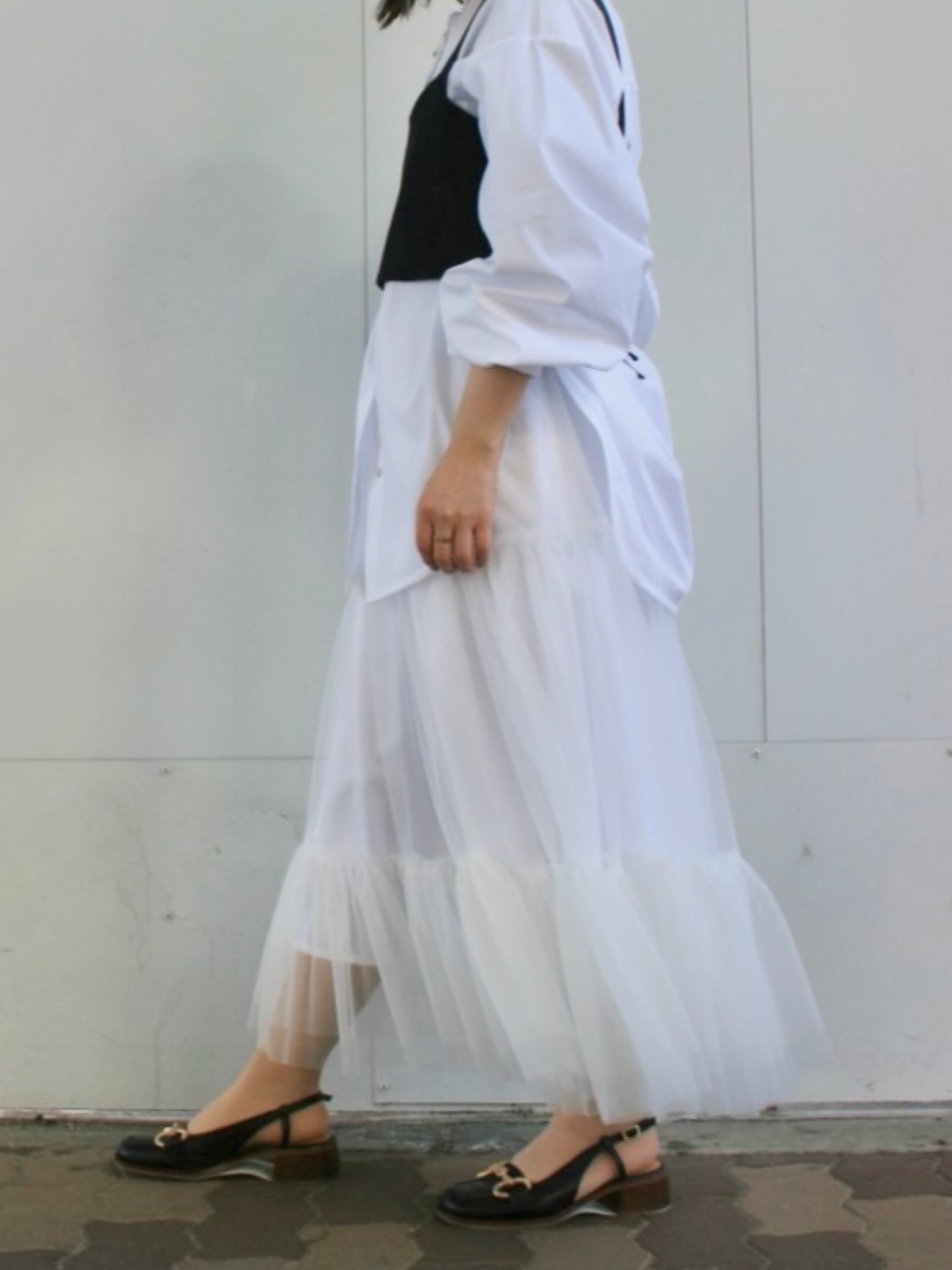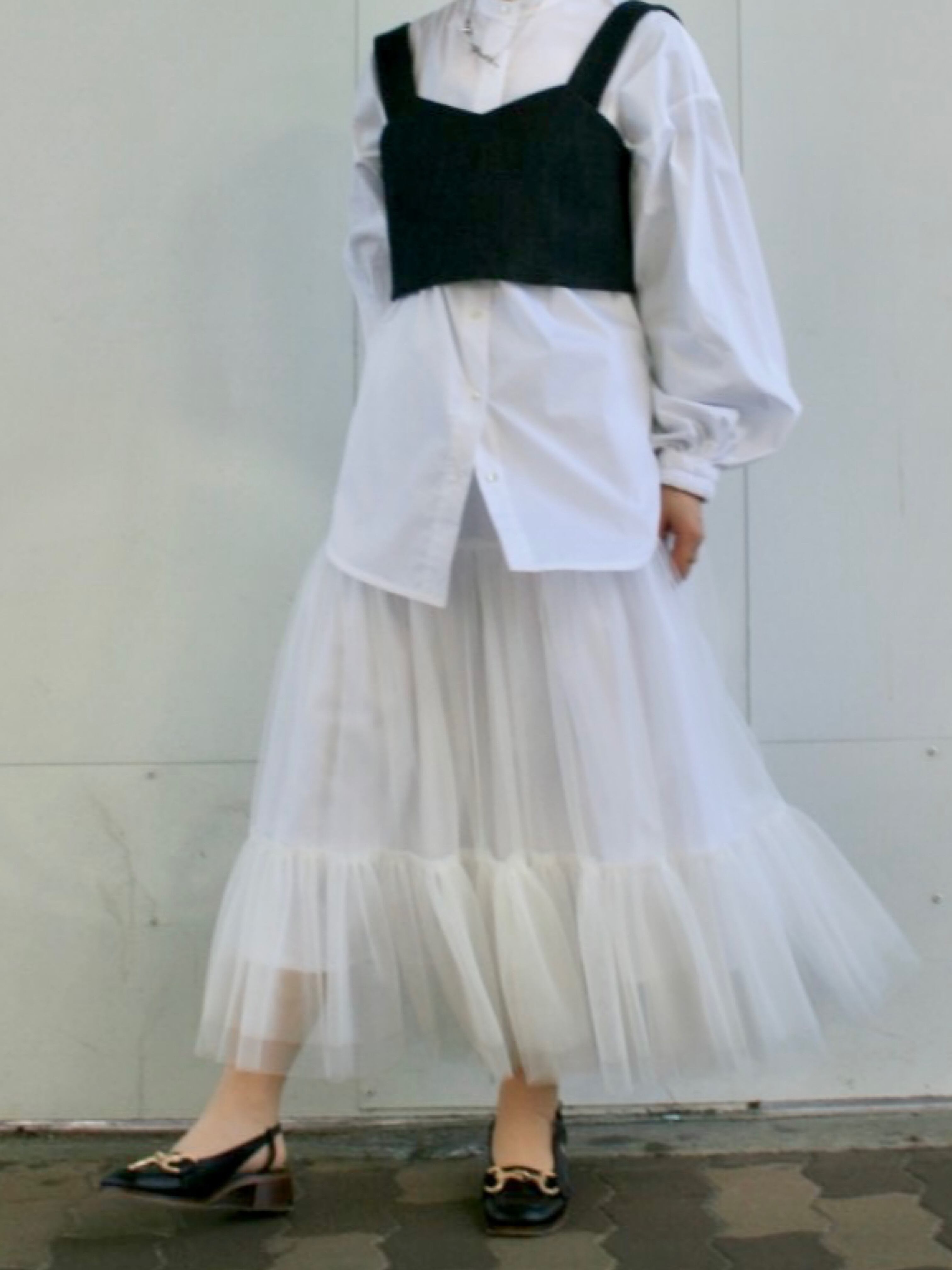 パンツスタイルの上にチュール部分のみを重ね着して、トレンド満載のコーディネートもおすすめです。