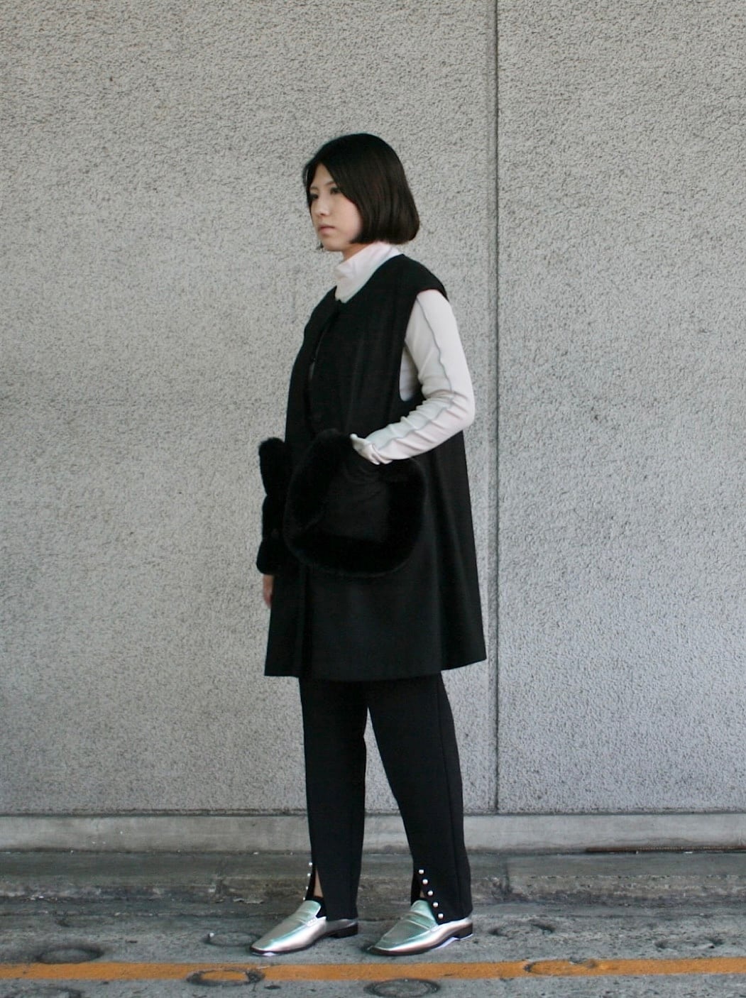 タートルネックやリボンブラウスなど、合わせるインナーで雰囲気を変えて楽しめます。